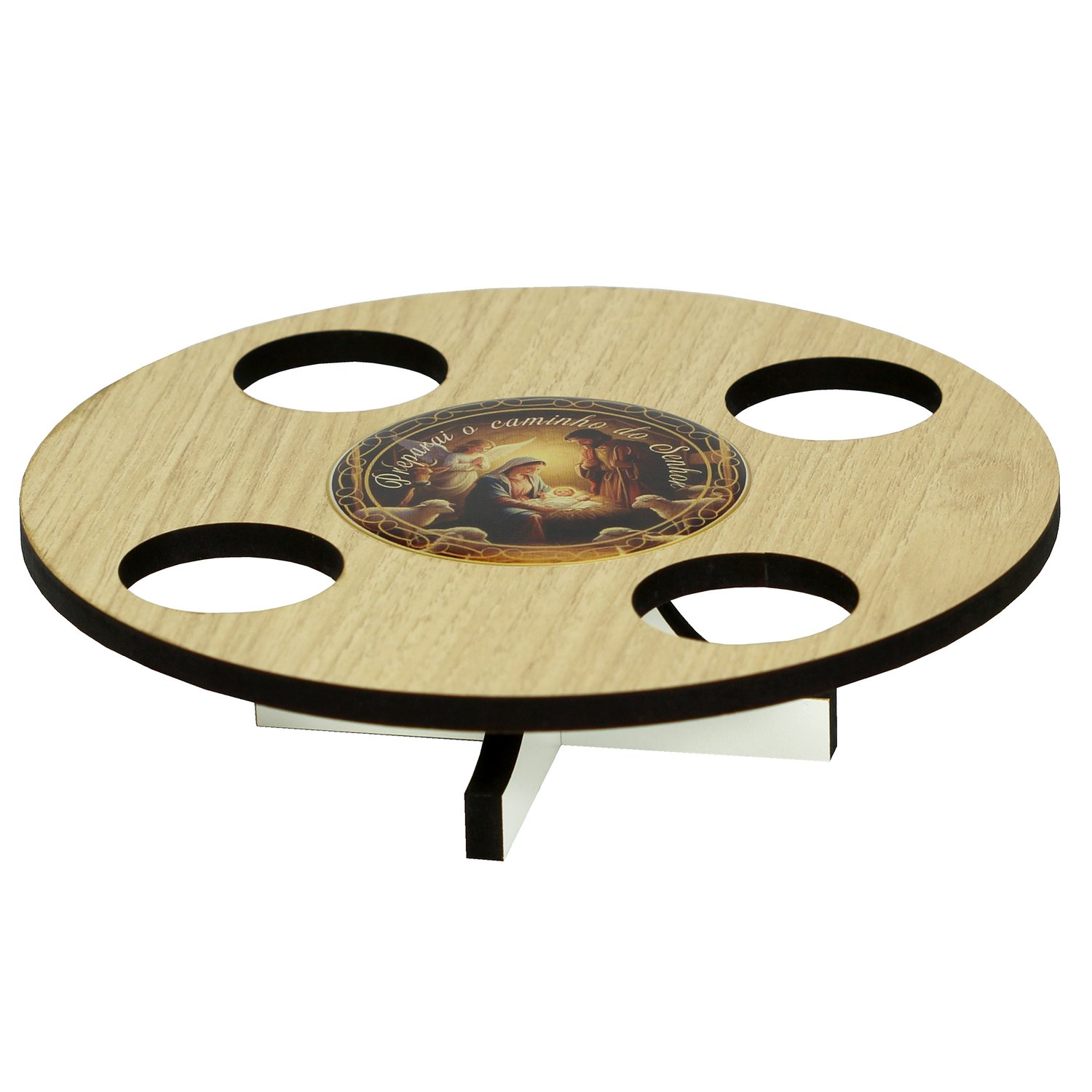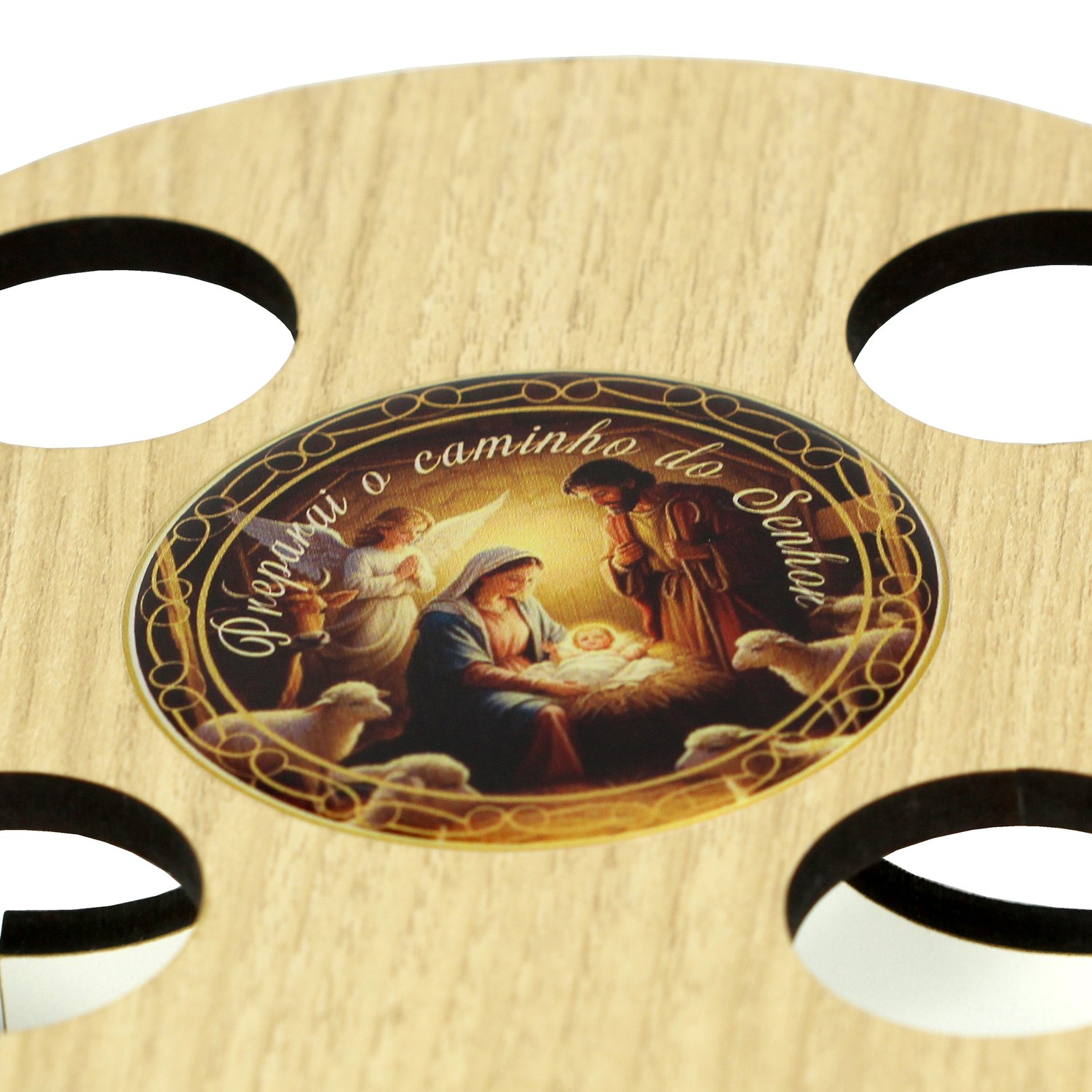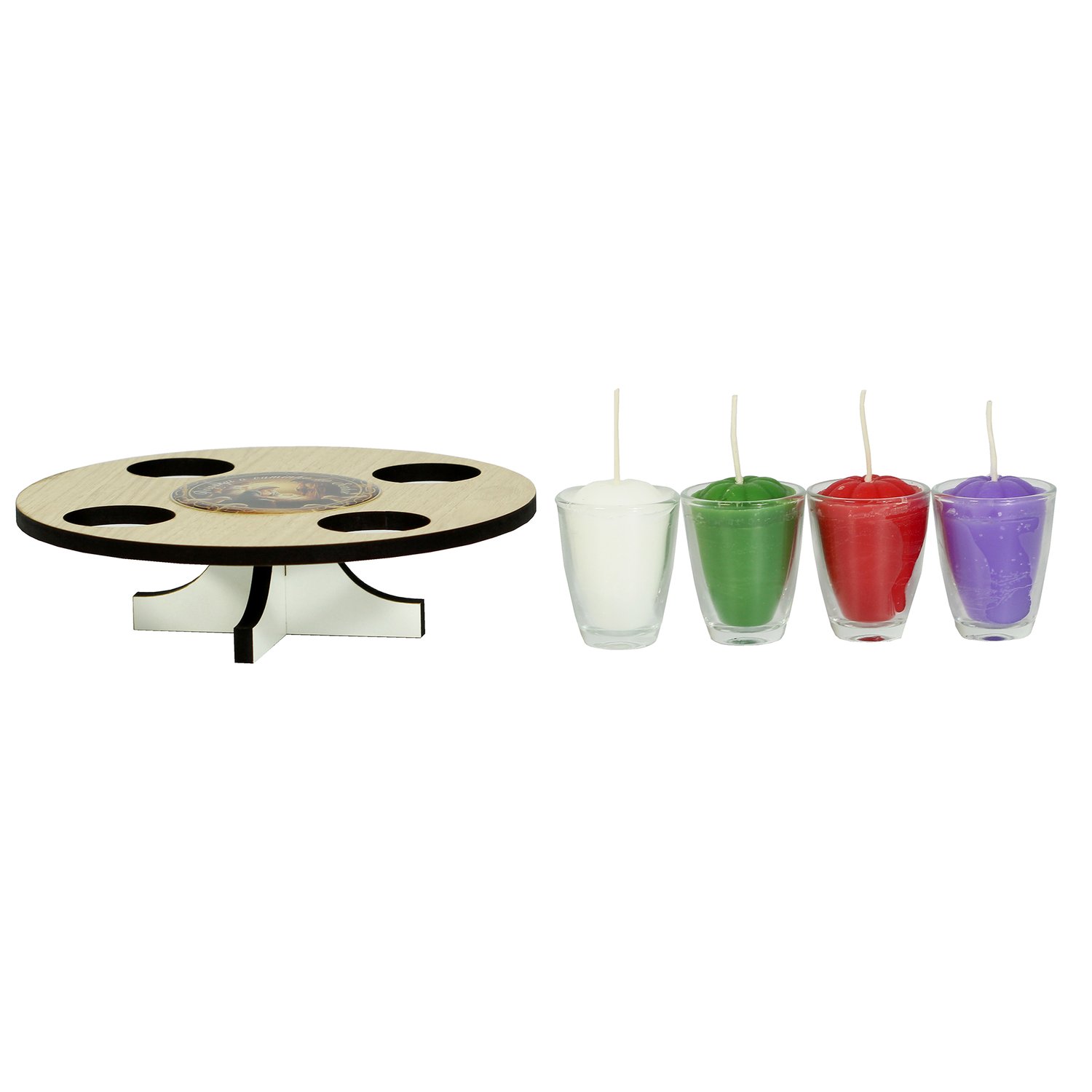 Suporte em MDF Carvalho/Branco com 4 velas no vidro do advento nas cores, branca, vermelha, verde e roxa.