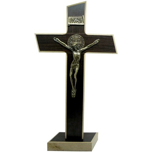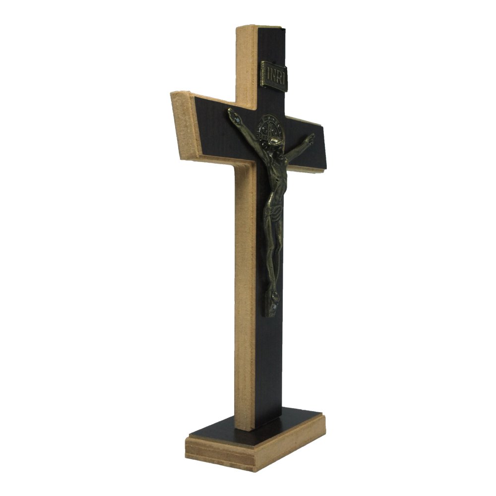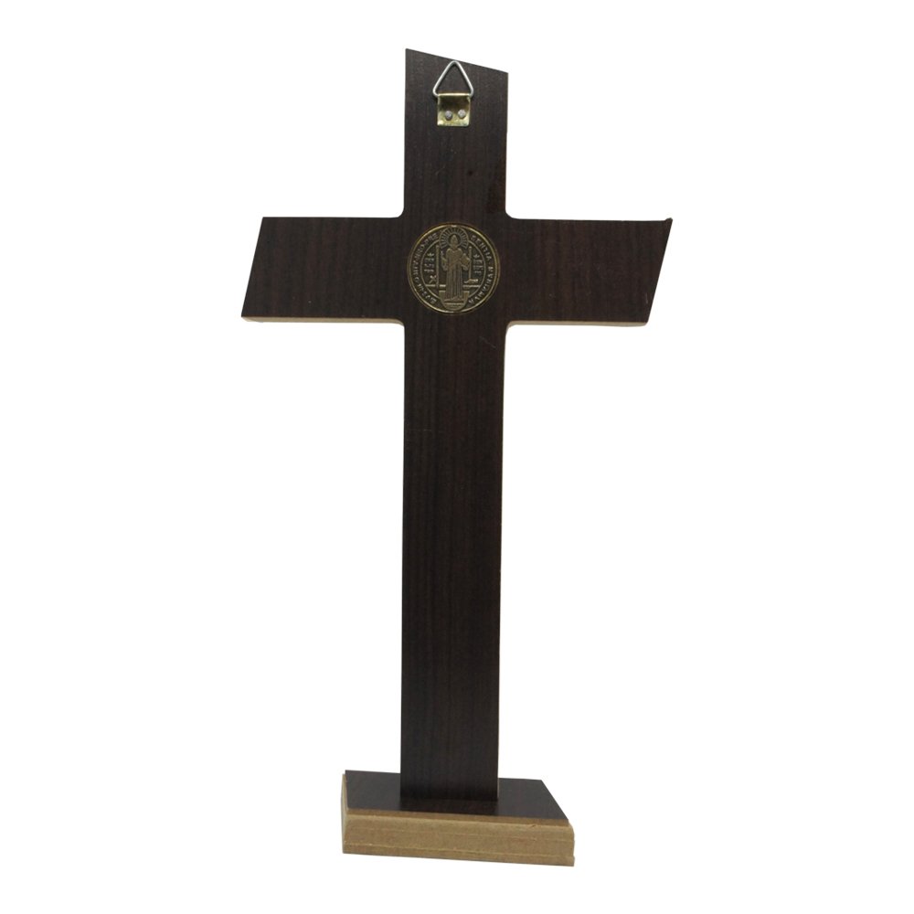 Crucifixo de madeira revestida, com imagem Cristo e medalha de São Bento em metal.