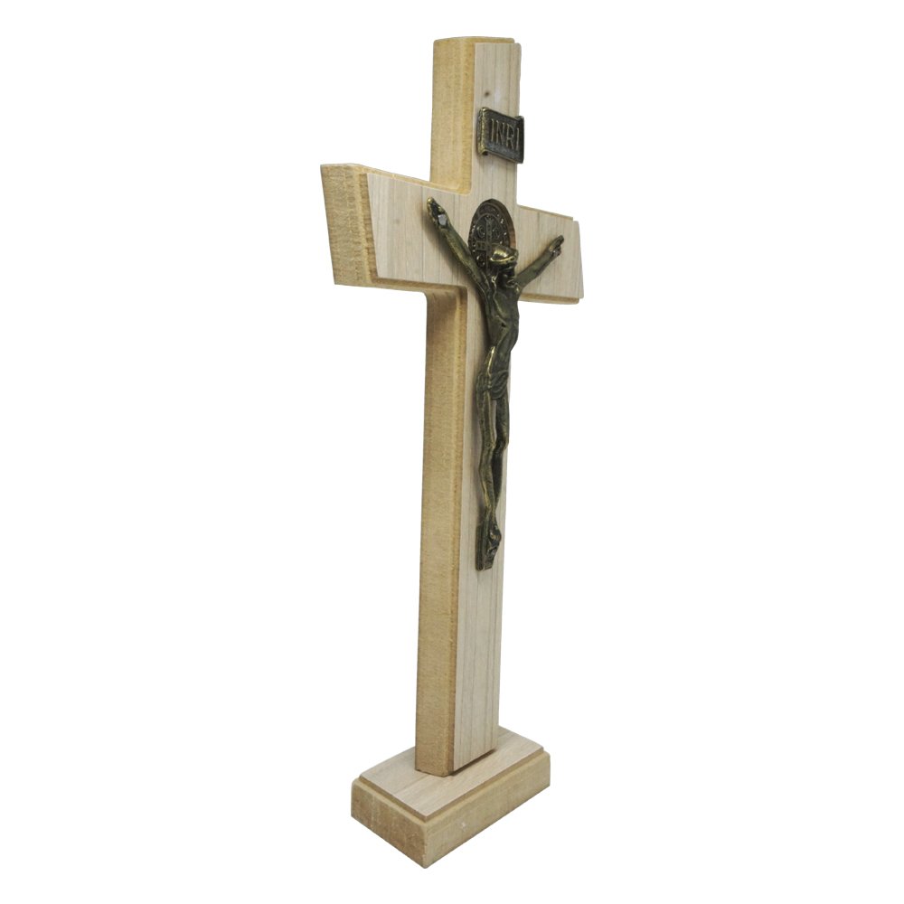 Crucifixo produzido em MDF com acabamento na cor Tirol, com base removível podendo ser utilizado sobre uma superfície ou pendurado na parede.