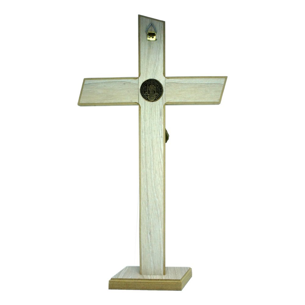 Crucifixo de madeira Tirol, com a imagem de Cristo e medalha de São Bento em metal.