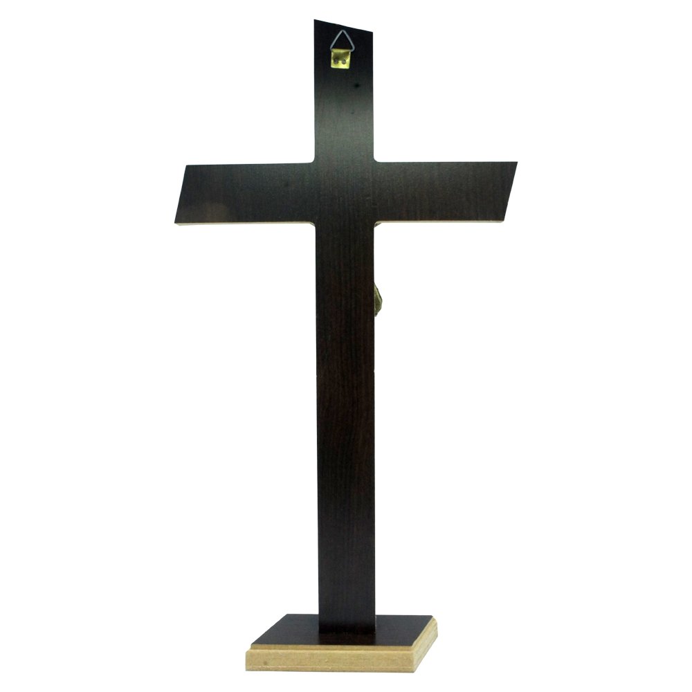 Crucifixo de madeira revestida, com a imagem de Cristo e medalha de São Bento em metal.
