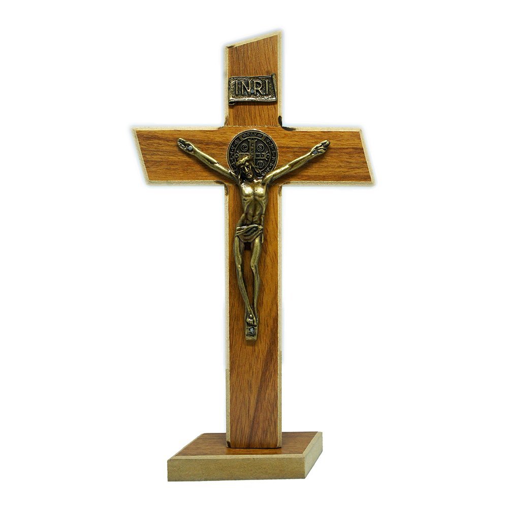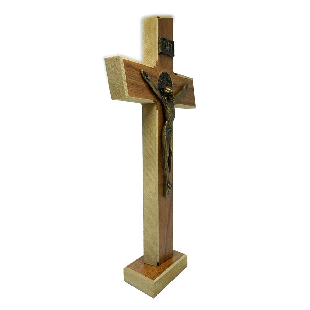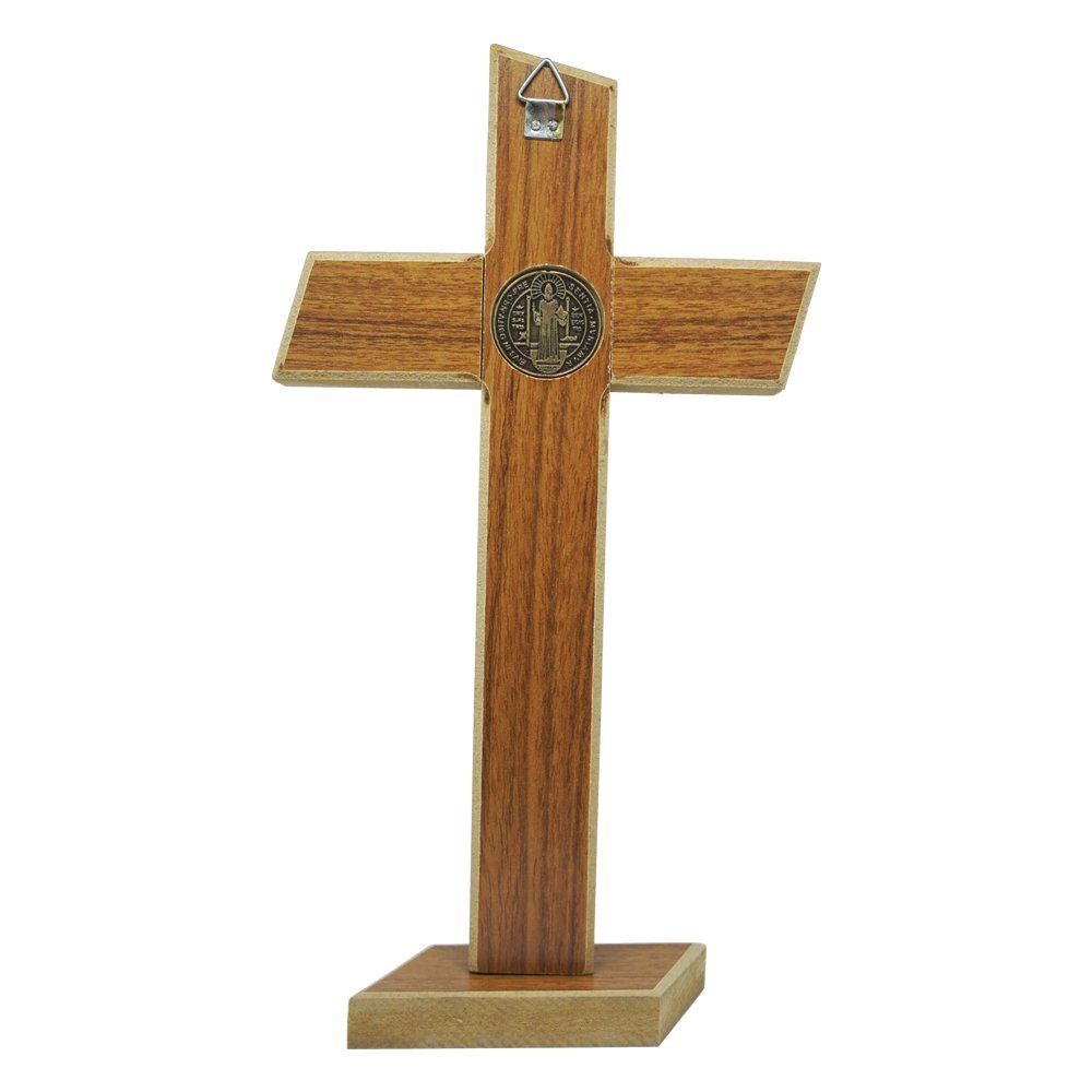 Crucifixo de madeira Athenas, com a imagem de Cristo e medalha de São Bento em metal.