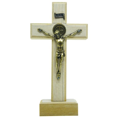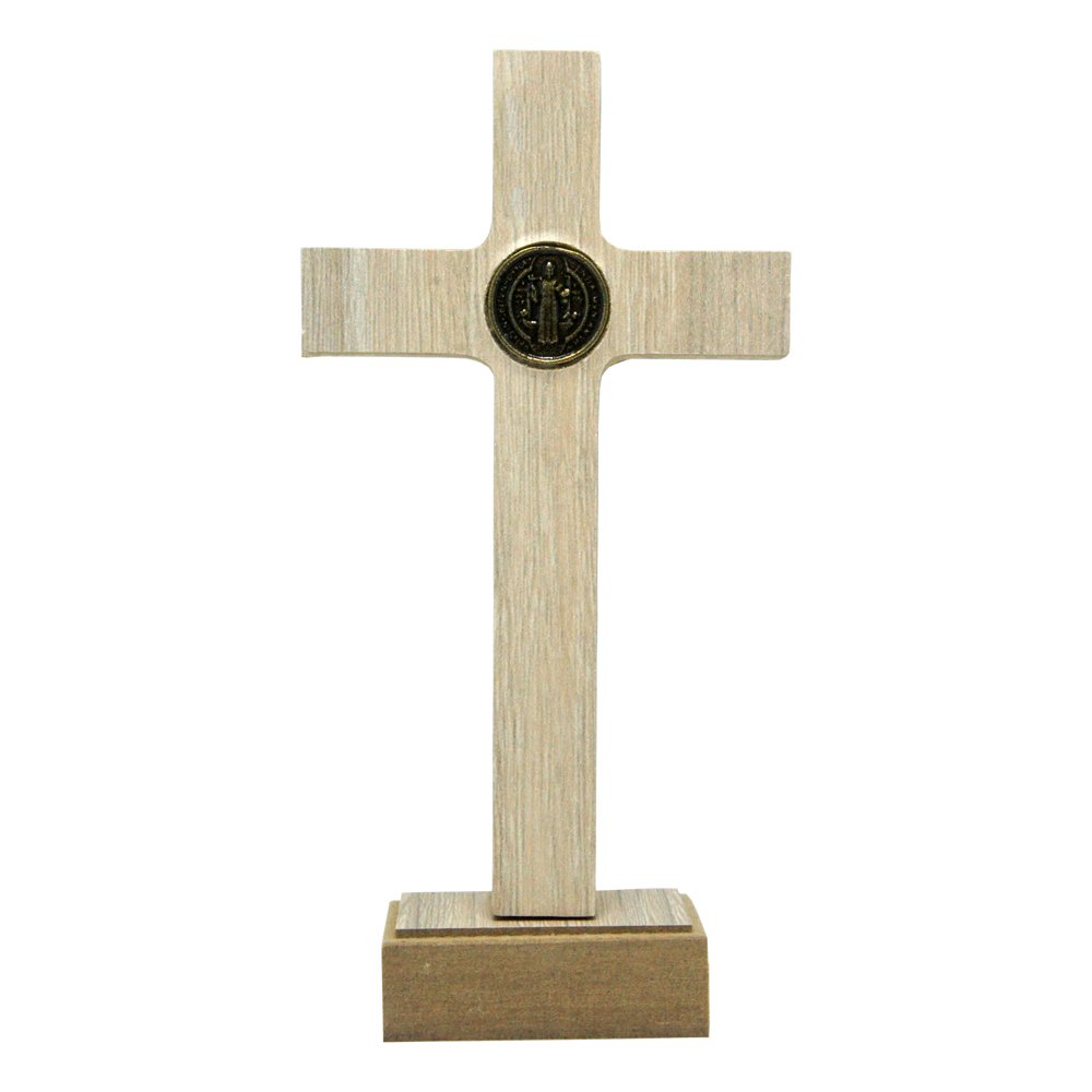 Crucifixo produzido em MDF com acabamento na cor Tirol, com base removível podendo ser utilizado sobre uma superfície ou pendurado na parede.