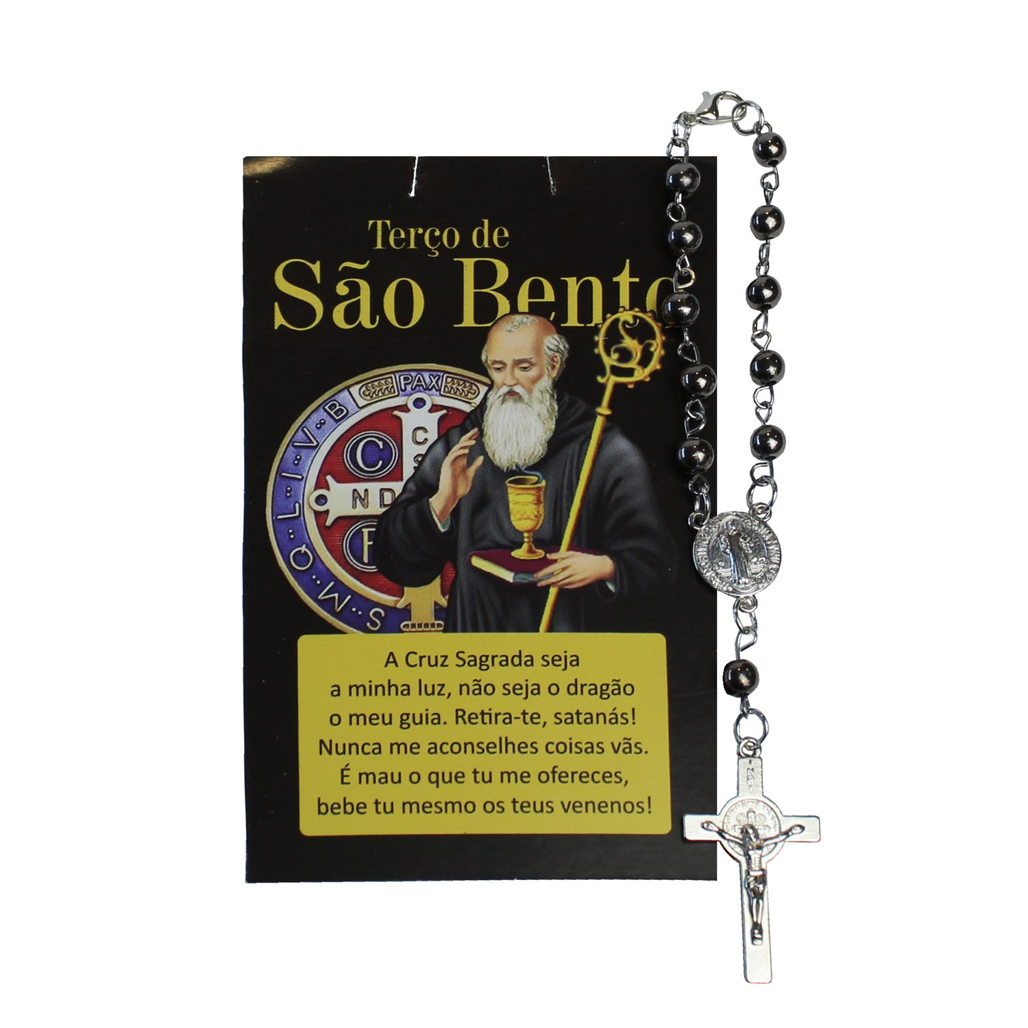 Dezena para carro com contas de hematita de 6mm, Medalha de São Bentono entremeio de aproximadamente 1,3cm de diâmetro em metal prateado, cruz preta com medalha de São Bento prateada, cruz medindo 3,5cm . Medida total de aproximadamente 15cm.