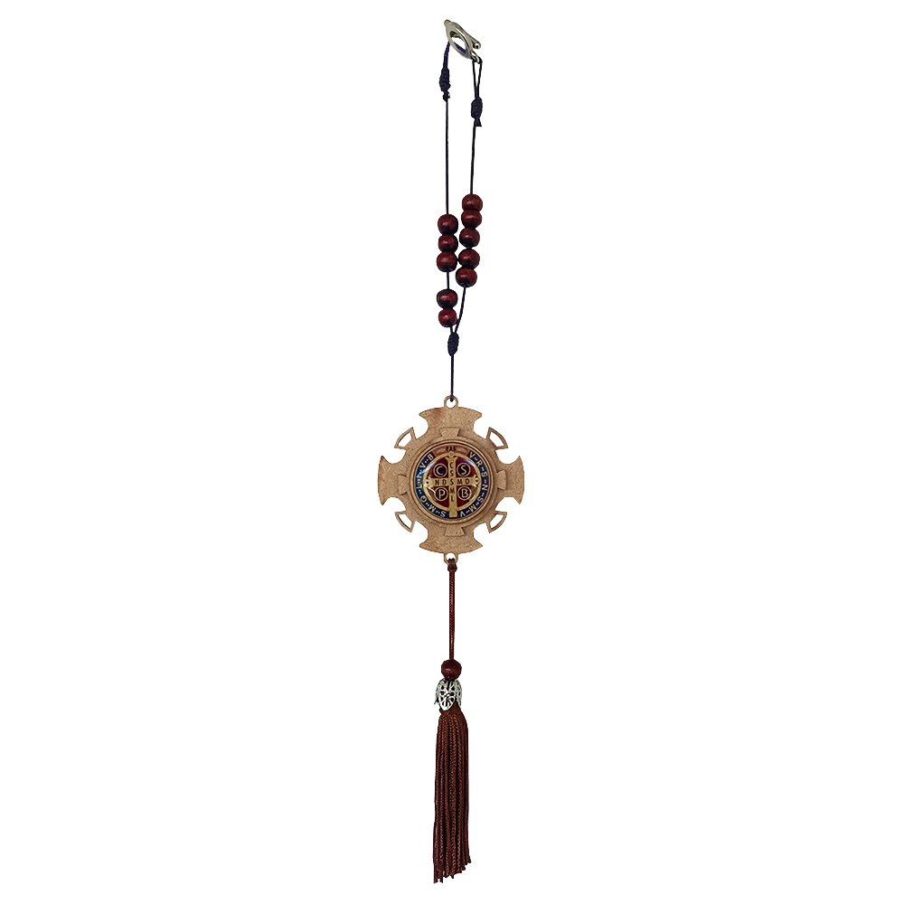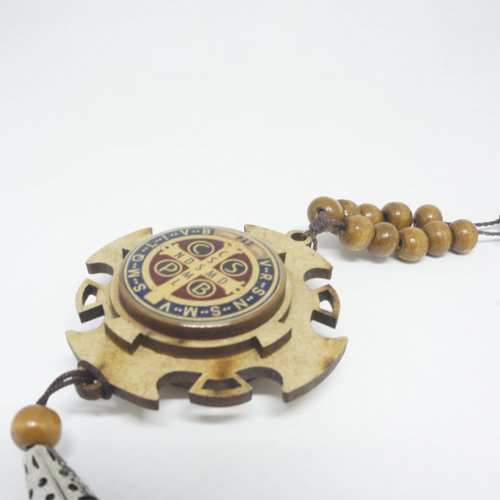 Dezena para carro produzida em MDF, estampa da medalha de São Bento frente e verso resinada, contas em madeira de 10mm, com pompom.