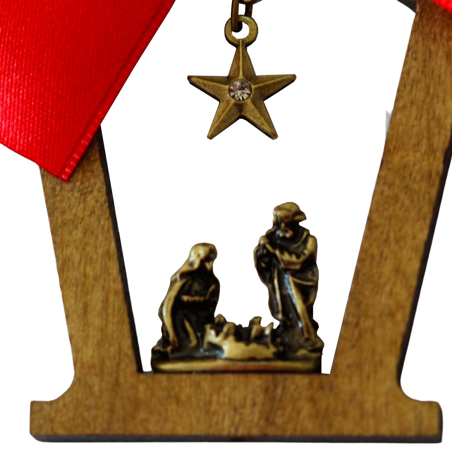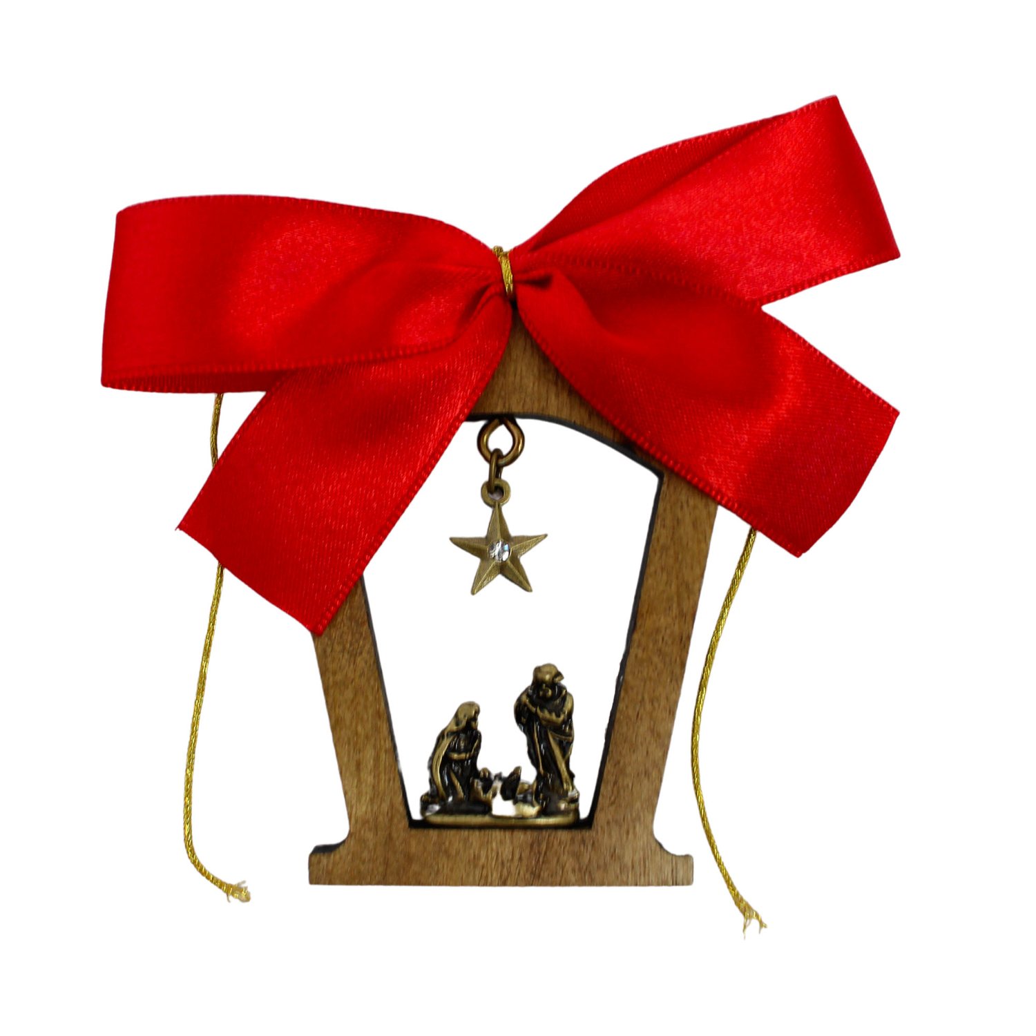Mini Lembrança de Natal em MDF com laços Vermelhos, Pingente de Estrela e Lembrança da Sagrada Família em Ouro Velho.