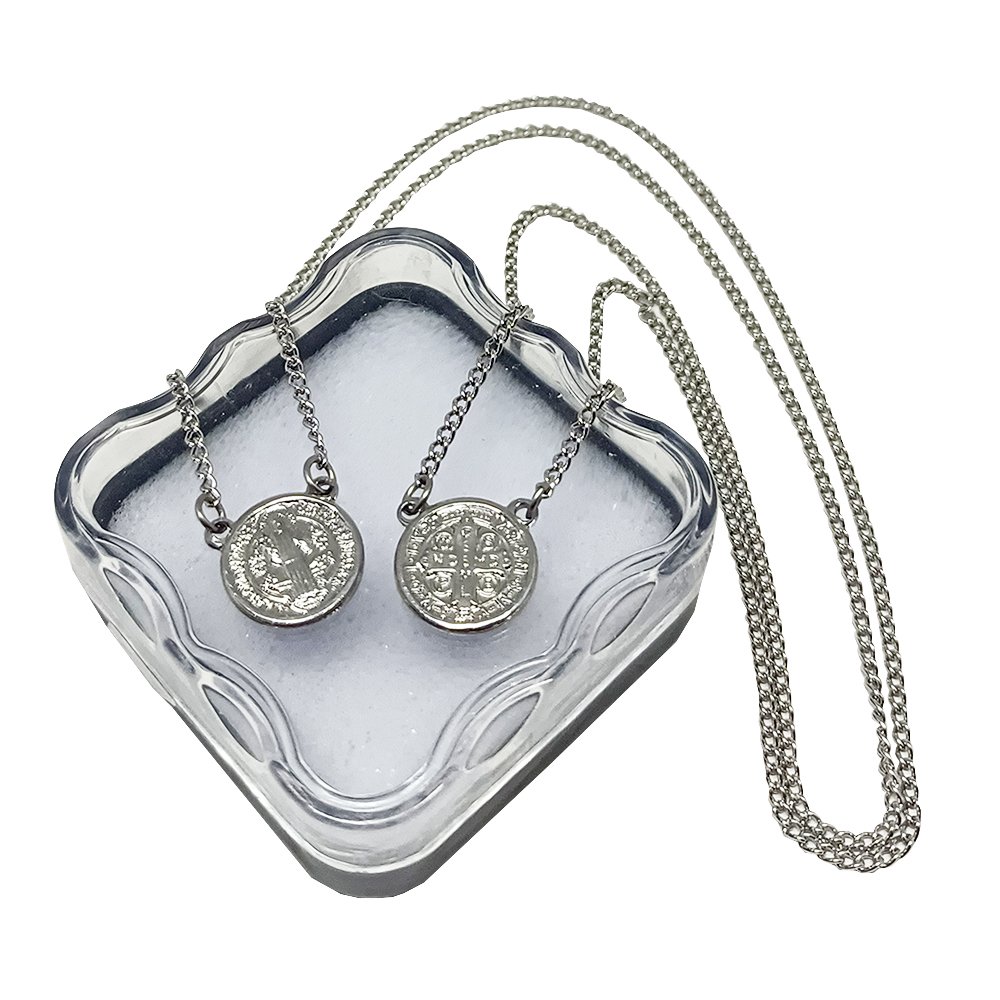Escapulário de Inox Redondo Relevo Medalha de São Bento, frente e verso nos dois lados.