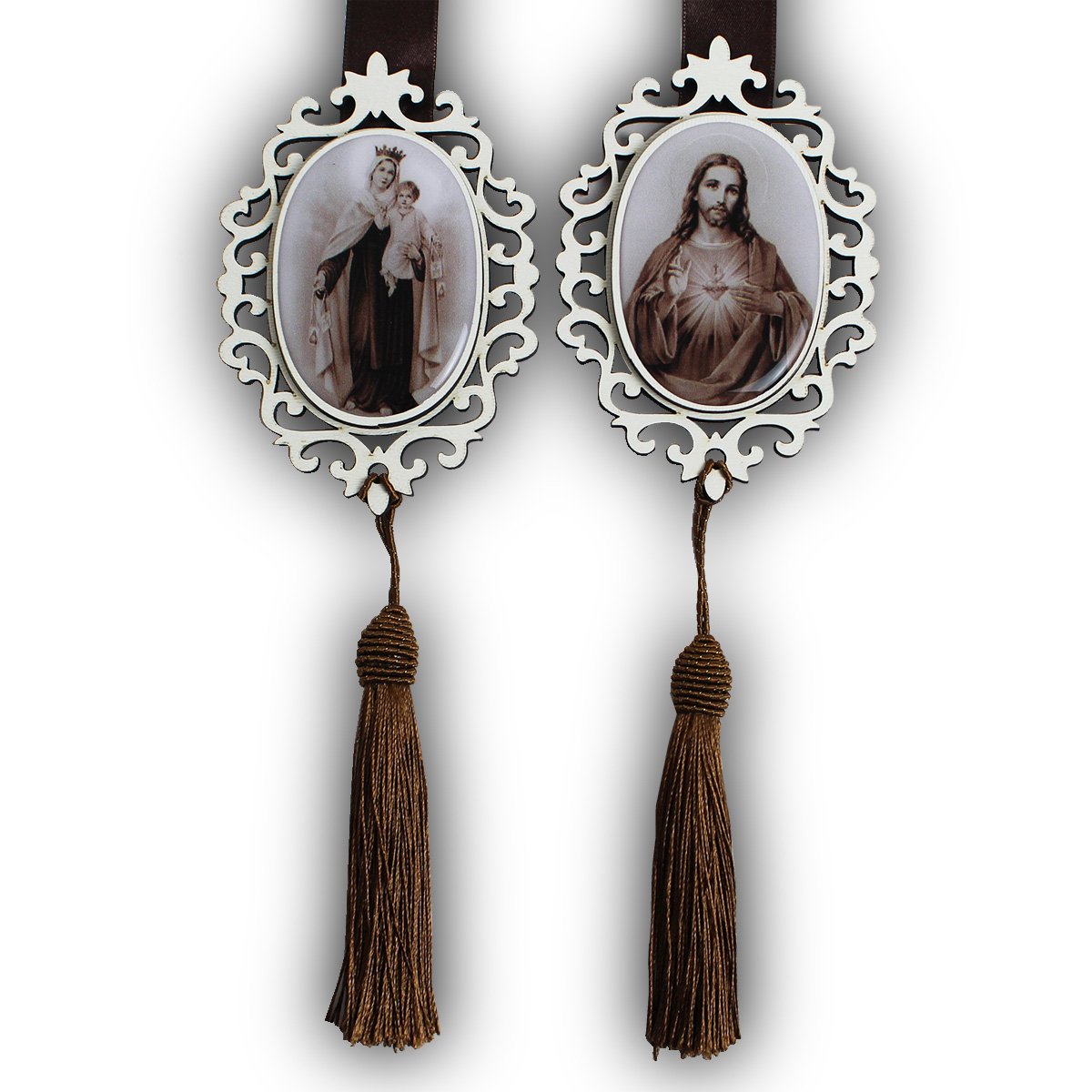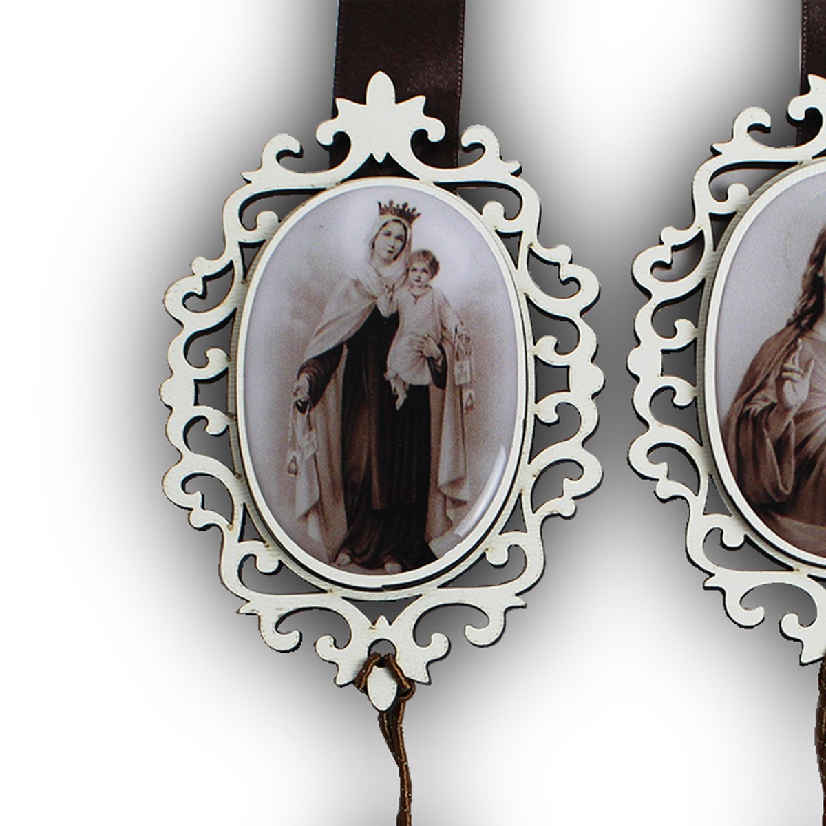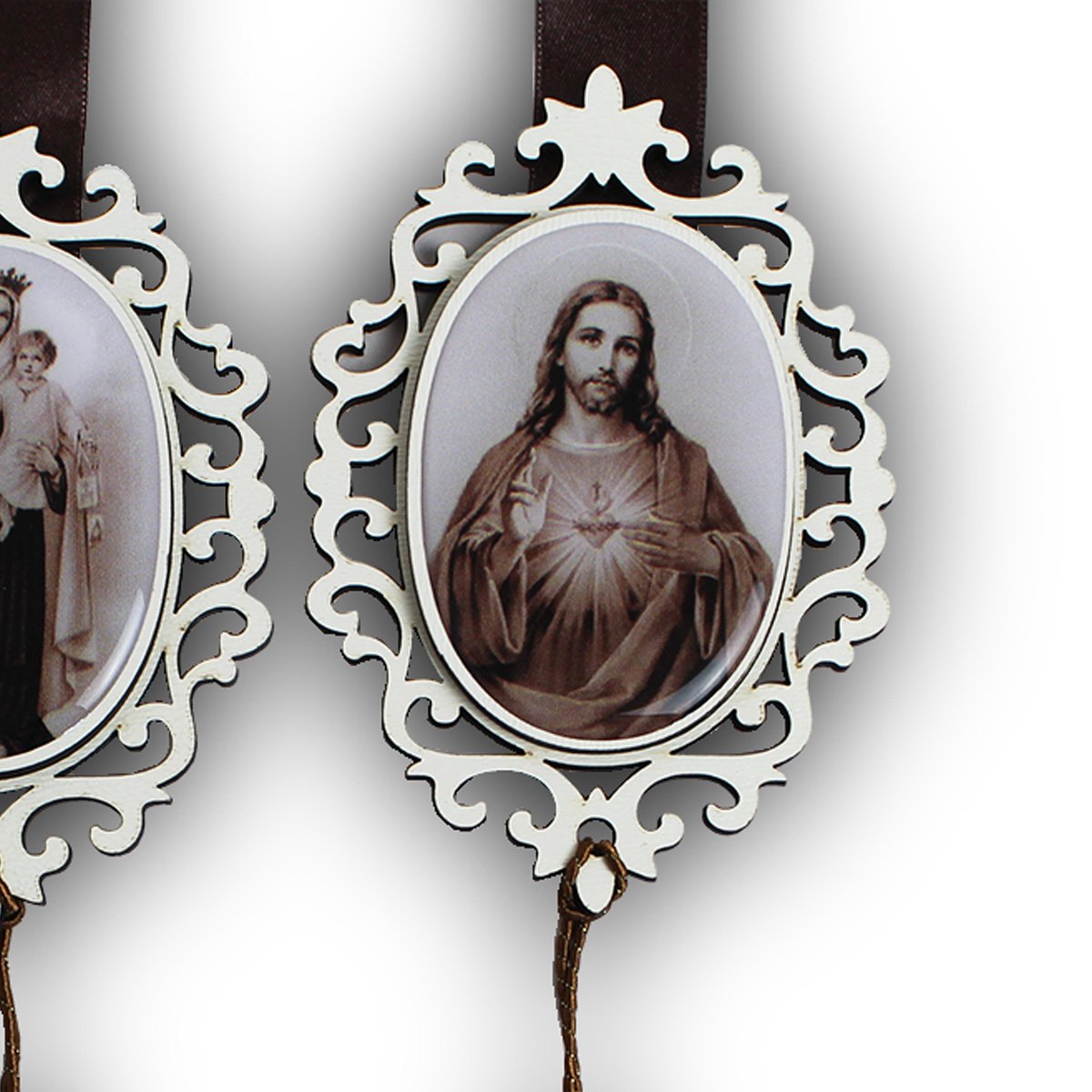 Adorno para porta com imagem do Sagrado Coração de Jesus e Nossa Senhora do Carmo, na cor sépia, produzido em MDF 3mm branco, no formato oval, com detalhes no corte em formato arabesco, acabamento em resina, adornado com pedras, pompom e uma fita de uma medalha a outra, possibilitando deixar uma medalha de cada lado da porta como um escapulário.