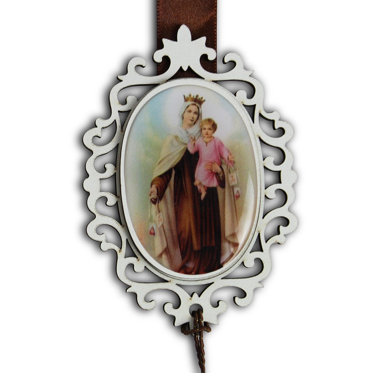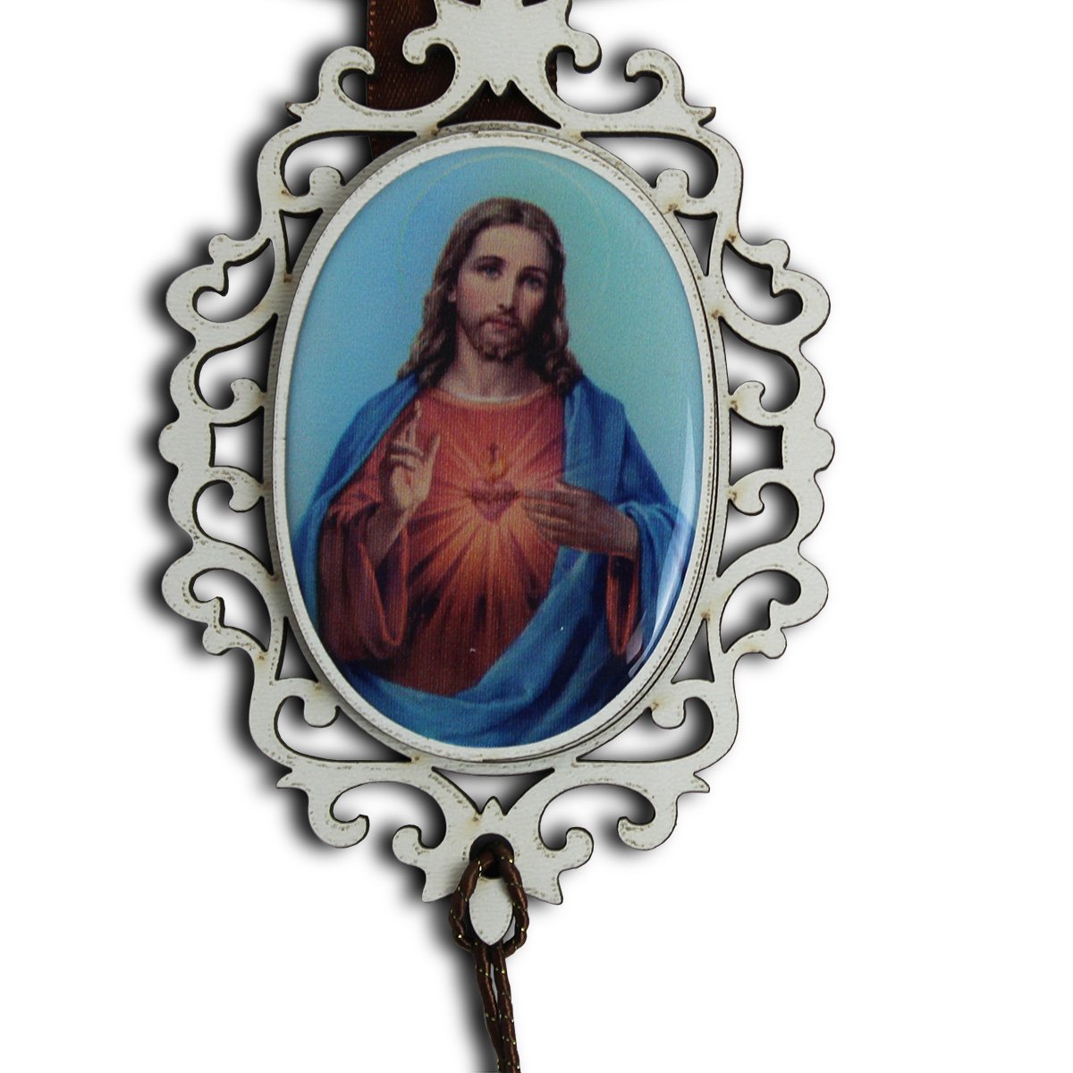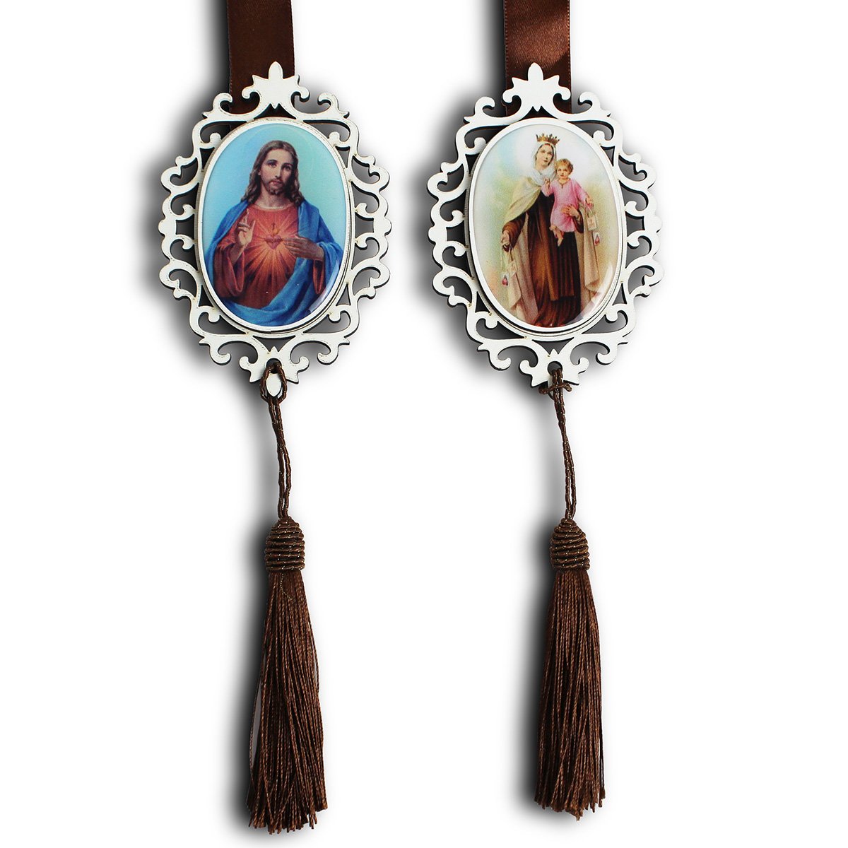 Adorno para porta, com imagem do Sagrado Coração de Jesus e Nossa Senhora do Carmo, estampa colorida, produzido em MDF 3 mm branco no formato Oval, com detalhes no corte em formato arabesco, acabamento em resina, pompom e uma fita que conecta uma medalha a outra, possibilitando deixar uma medalha de cada lado da porta como um escapulário.