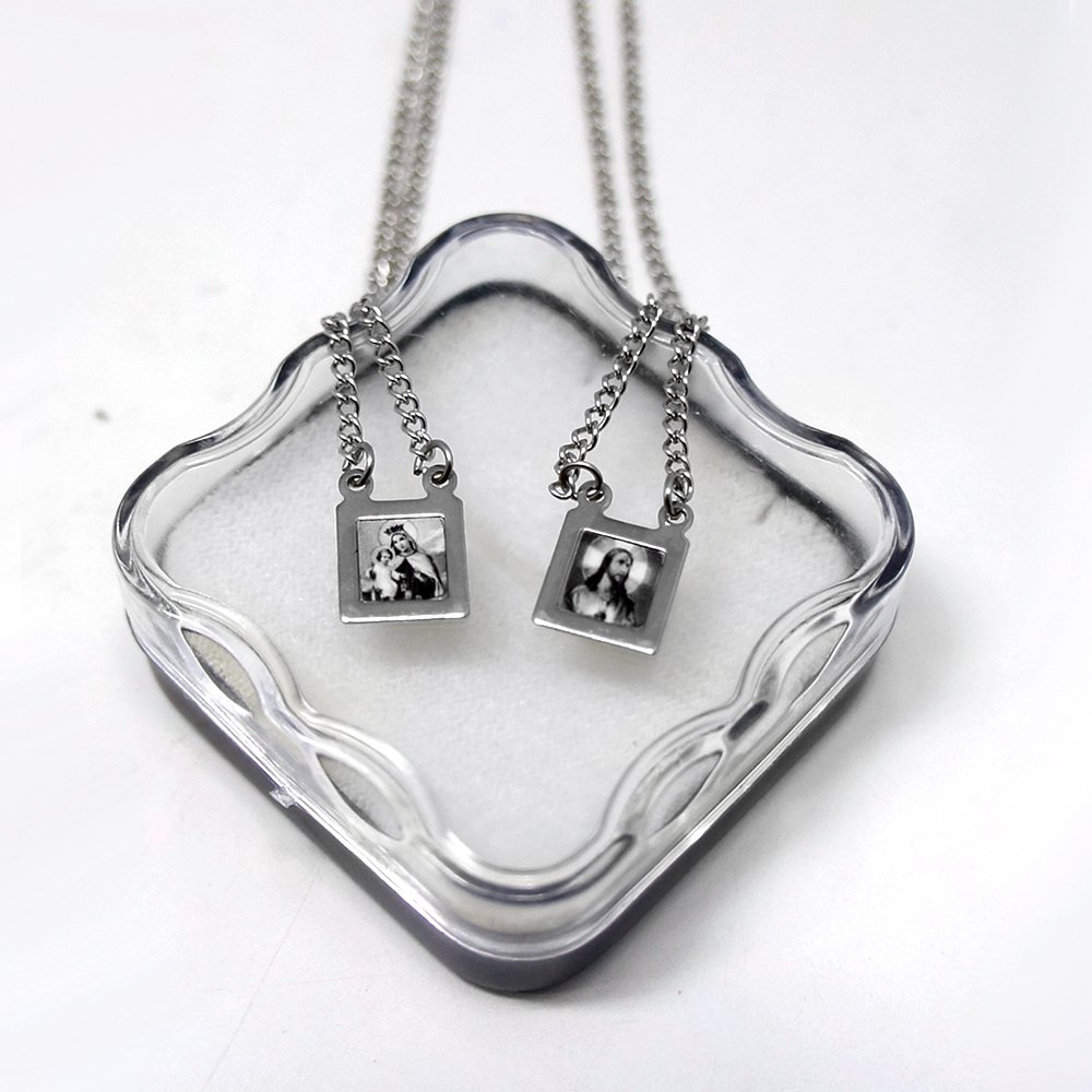 Mini Escapulário de Inox Quadrado Moldura Lisa e Centro com foto Preto e Branco de Nossa Senhora do Carmo e Sagrado Coração de Jesus.