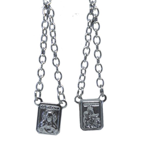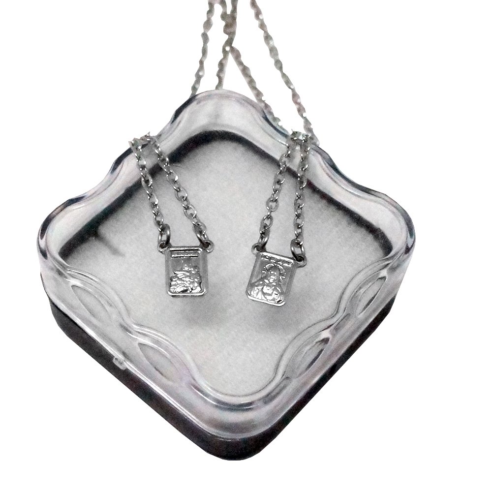 Mini Escapulário Sem Moldura de Inox Retangular em Relevo de Nossa Senhora do Carmo e Sagrado Coração de Jesus.