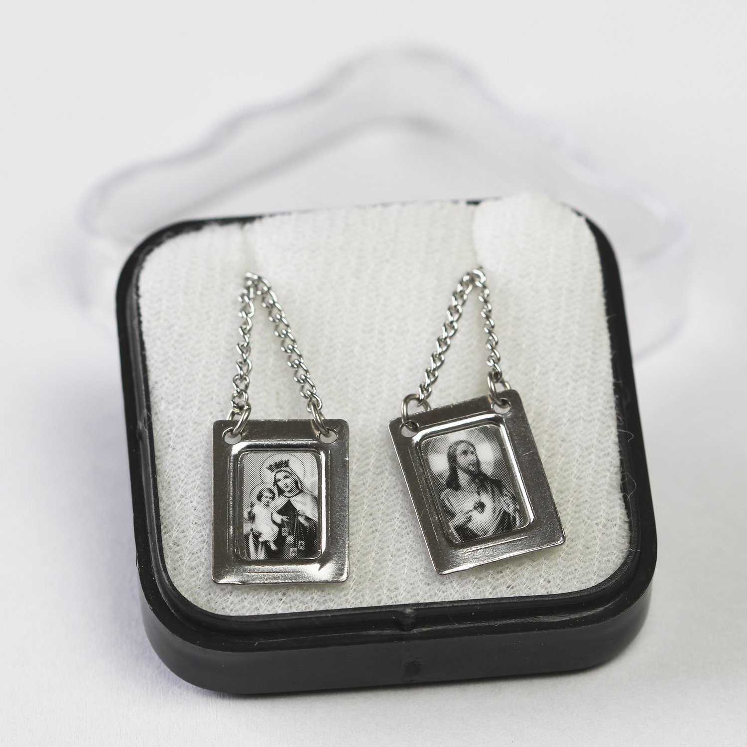 Escapulário de Inox Retangular Moldura Lisa e Preto e Branco Colorido de Nossa Senhora do Carmo e Sagrado Coração de Jesus.