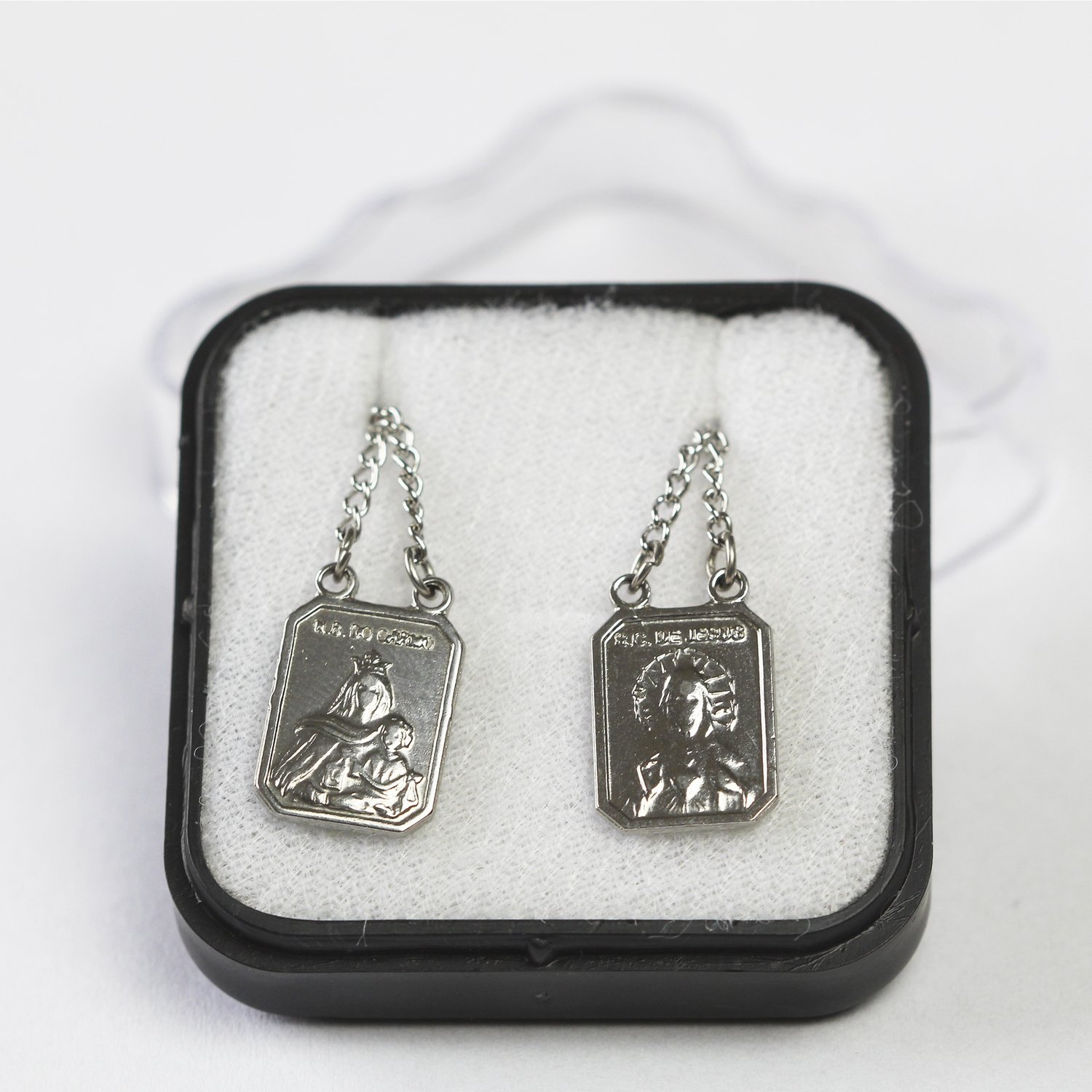 Escapulário Sem Moldura de Inox Retangular em Relevo de Nossa Senhora do Carmo e Sagrado Coração de Jesus.