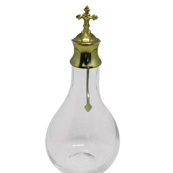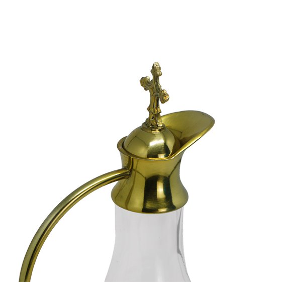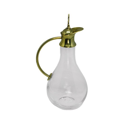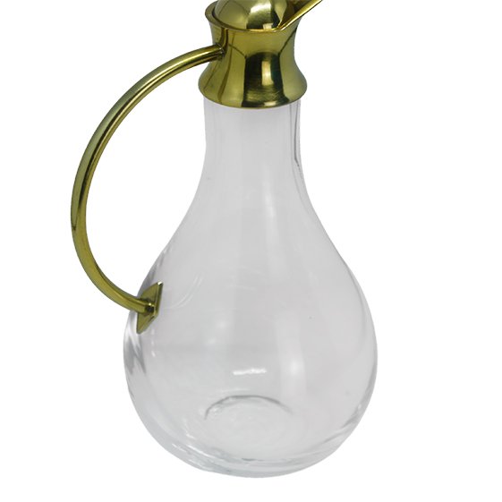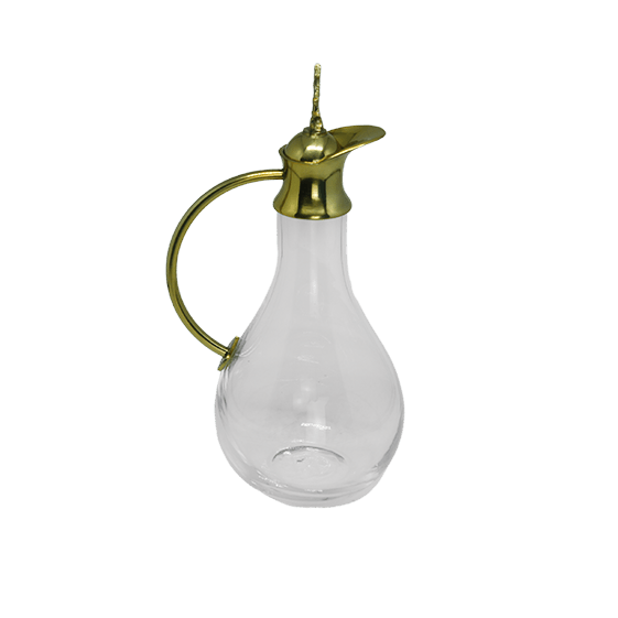 Galheta de Vidro com detalhes dourados, medindo 13,5cm de altura.