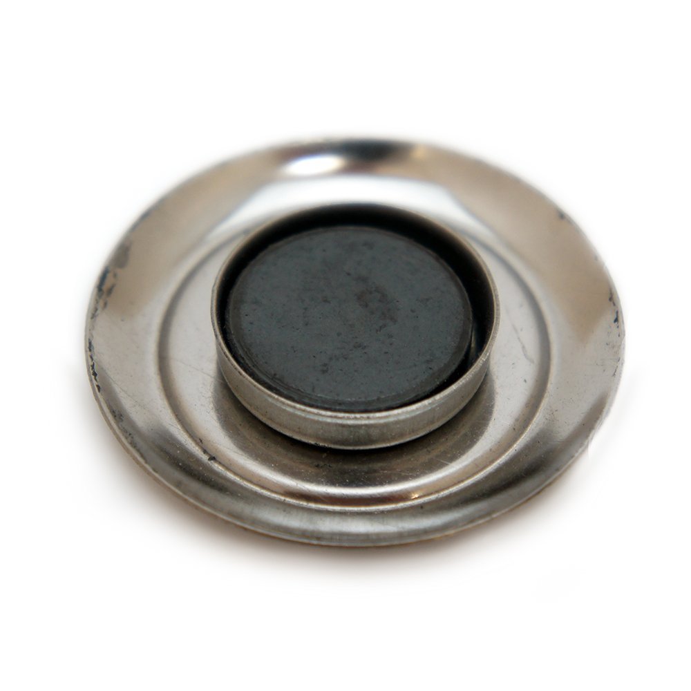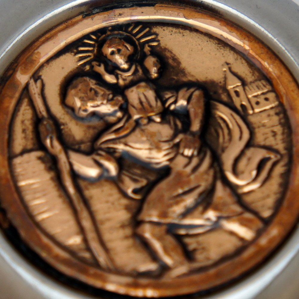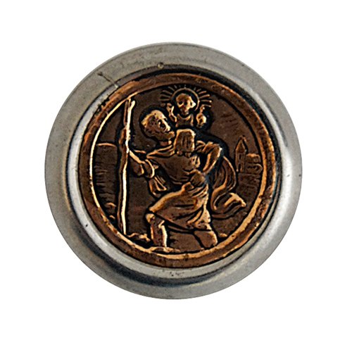 Imã feito em material metálico, estampa alto relevo de São Cristovão na cor bronze, aro prateado, diâmetro total de 4cm aproximadamente.