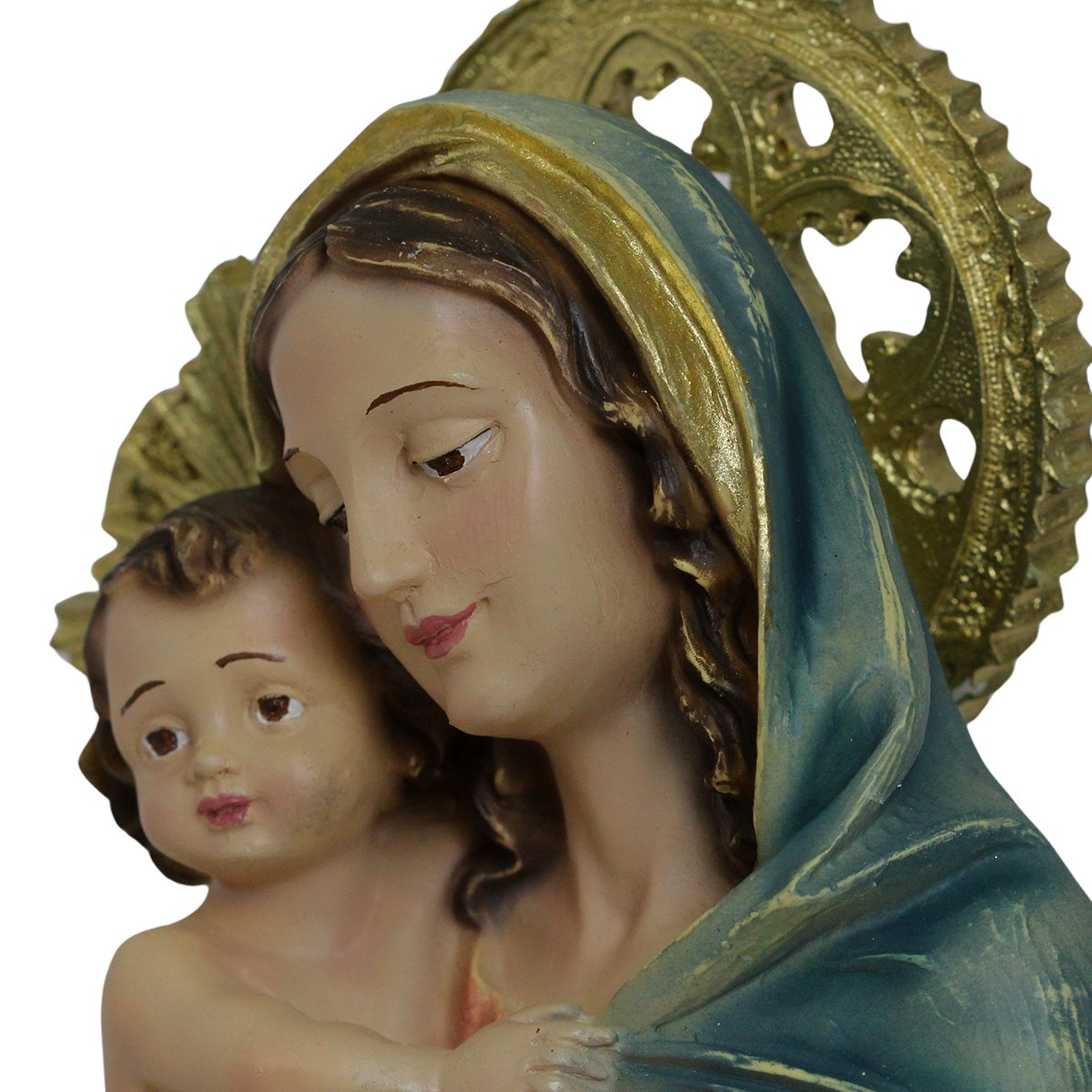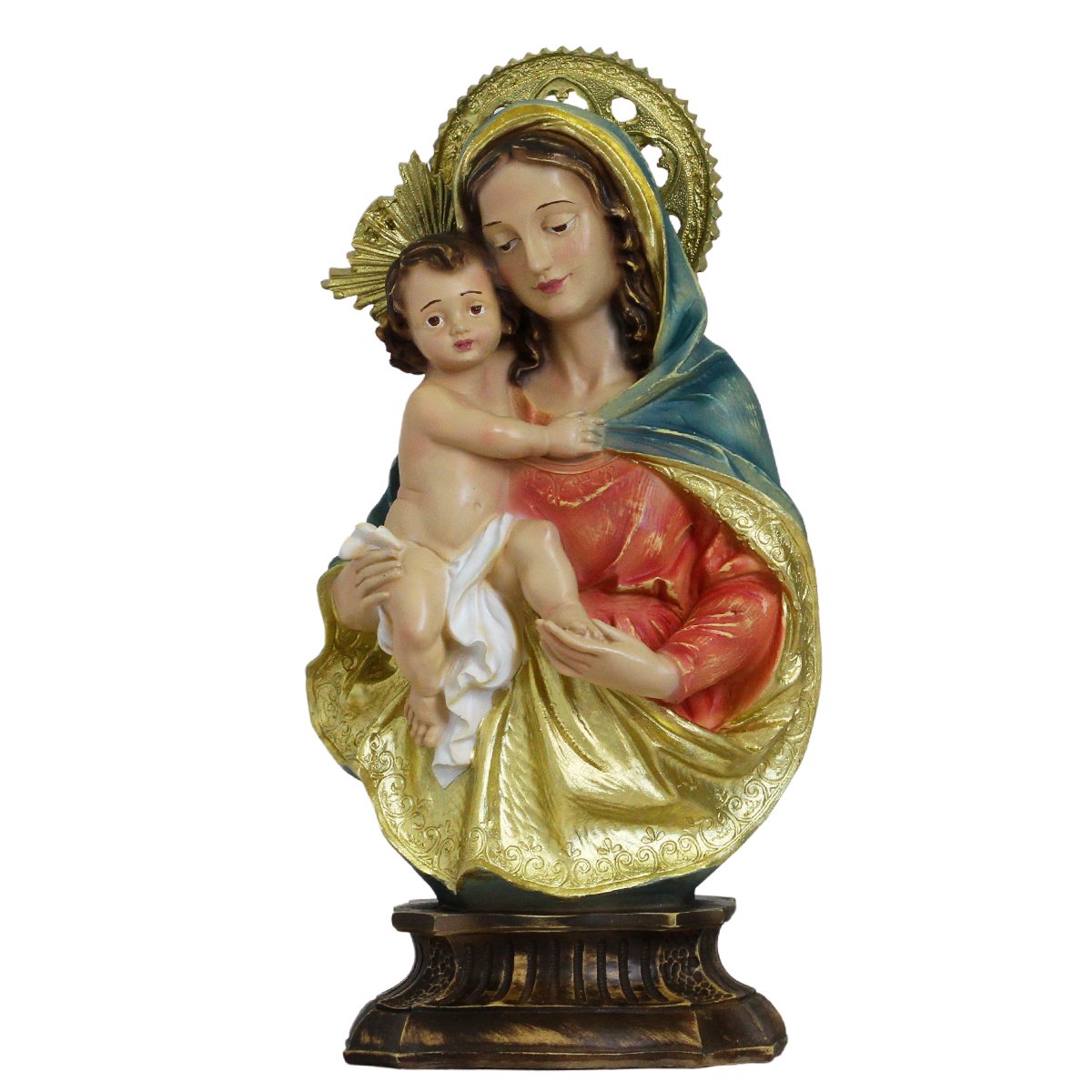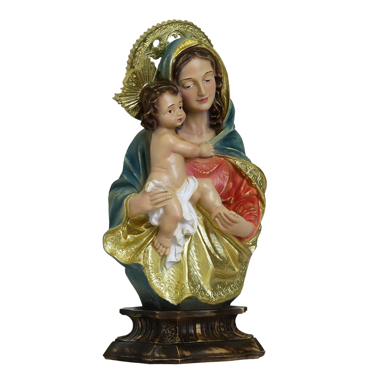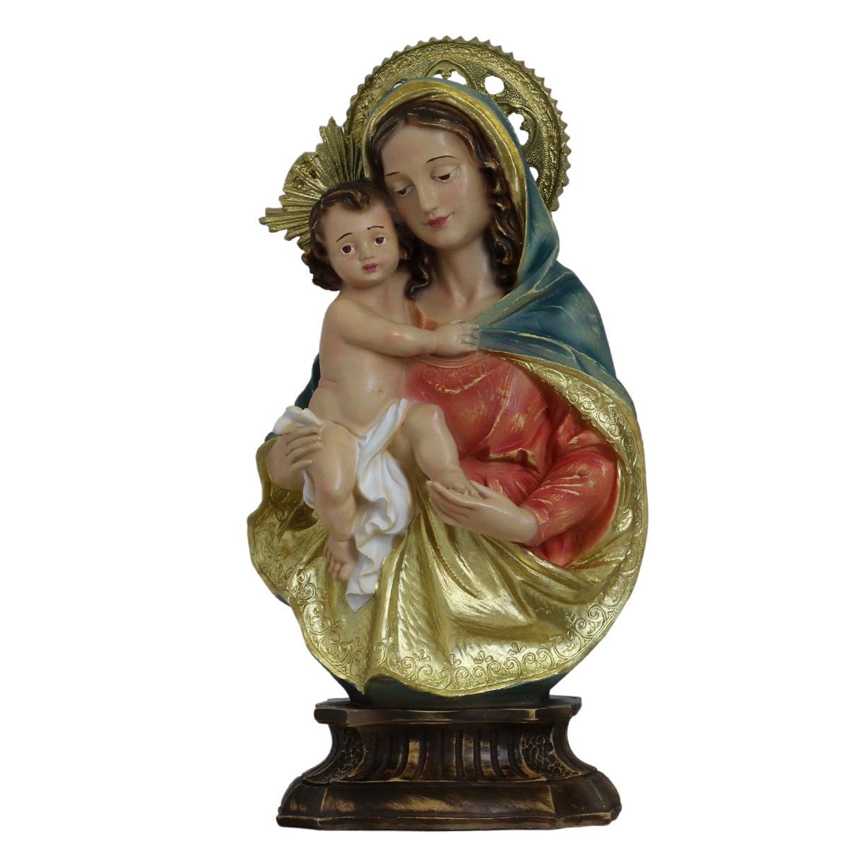 Imagem de Nossa Senhora da Divina Procidência de Resina linha premium, medindo aproximadamente 34 cm de altura e 17 cm de largura e 11 cm de profundidade.