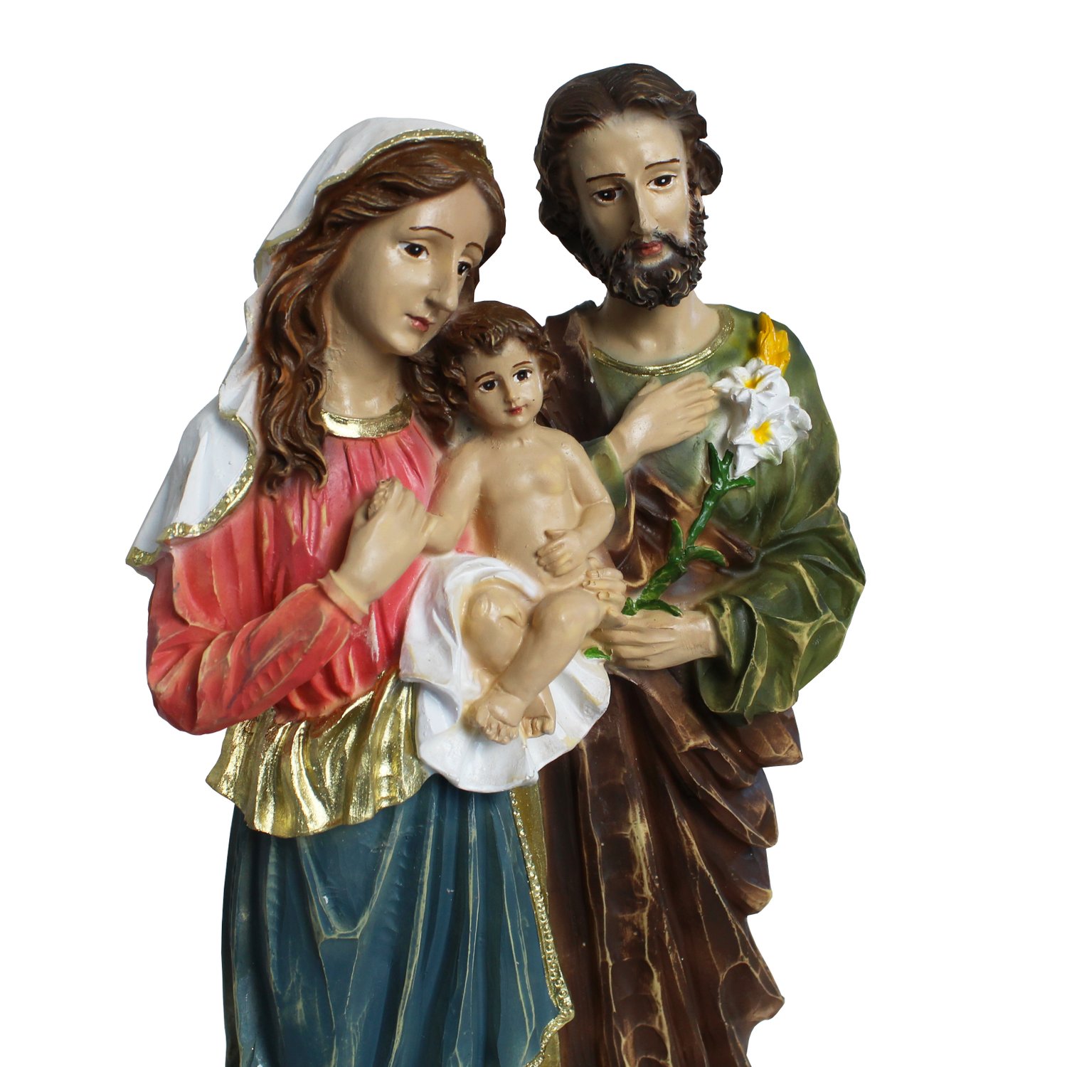 Imagem da Sagrada Família em resina linha premium, medindo aproximadamente 32 cm de Altura, 17 cm de Largura, 8,5 cm de Profundidade.
