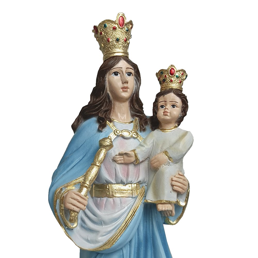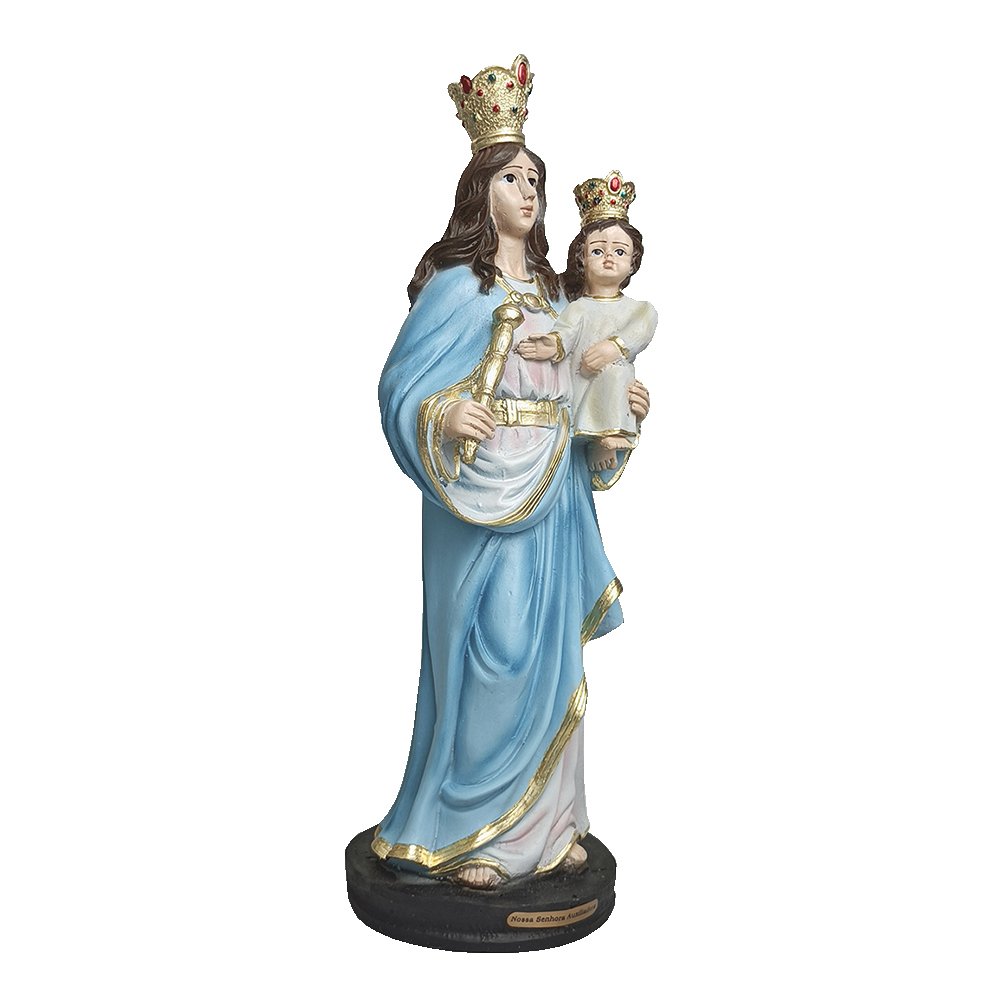 Imagem de Nossa Senhora Auxiliadora produzida em resina, a peça possui traços delicados, riqueza de detalhes e excelente acabamento.