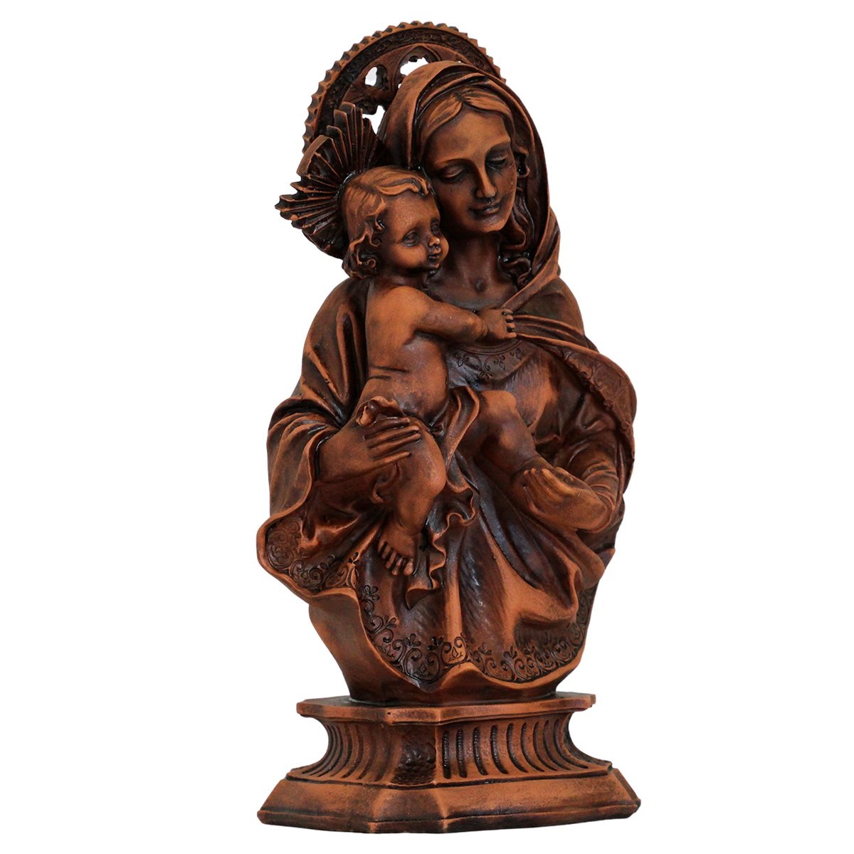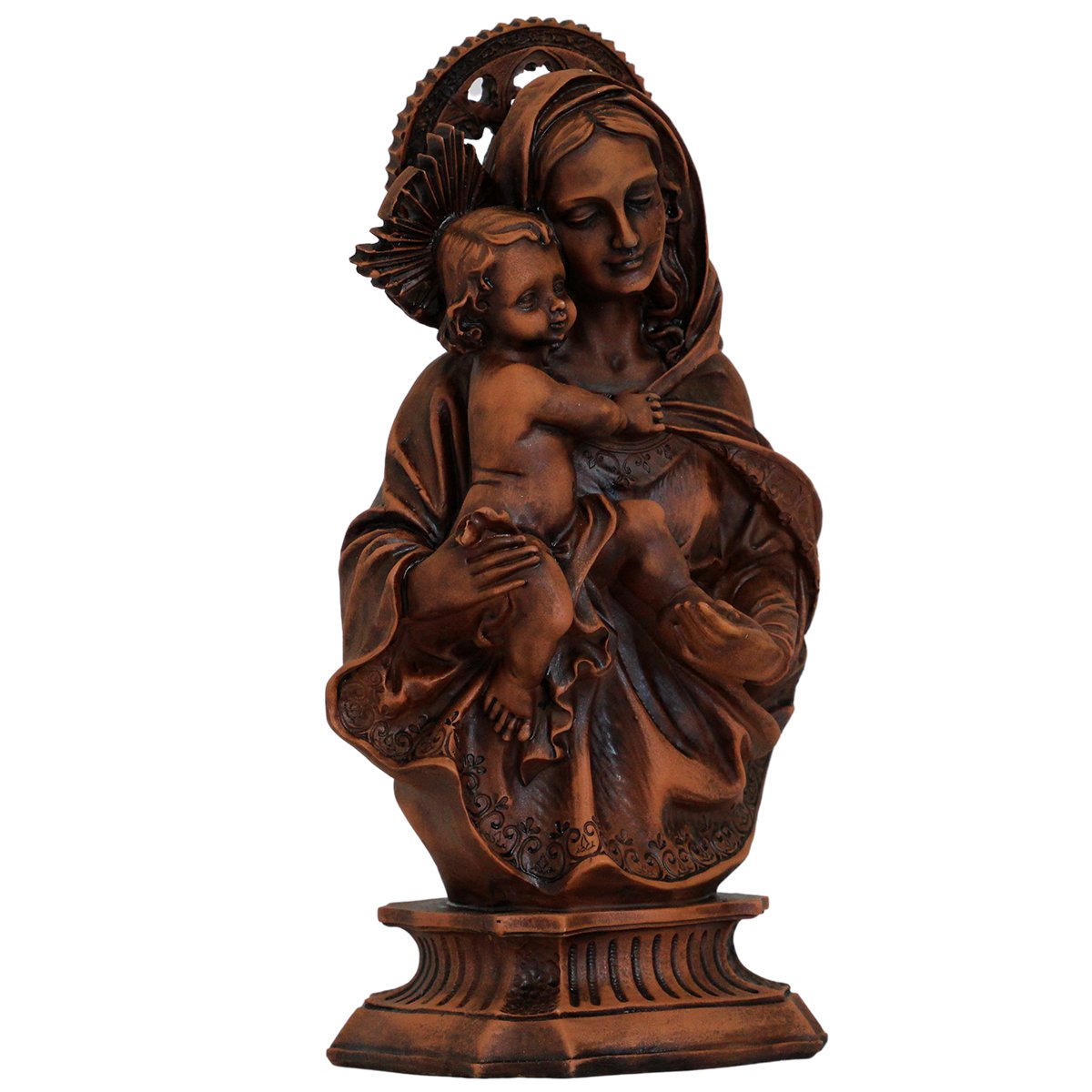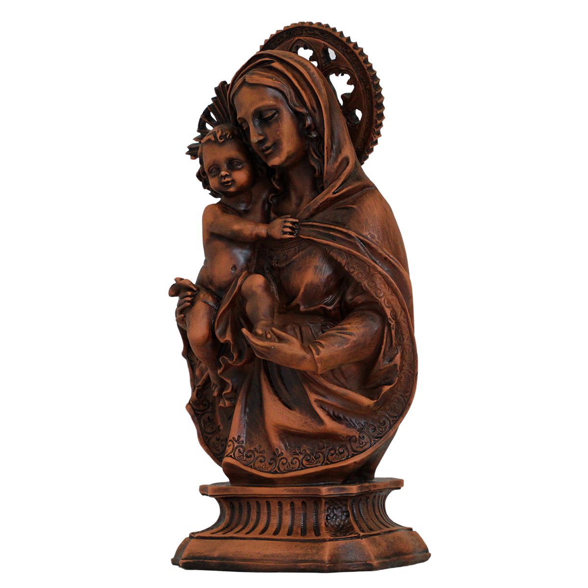 Imagem de Nossa Senhora da Divina Providência de Resina (Efeito Madeira), medindo aproximadamente 34 cm de altura e 17 cm de largura e 11 cm de profundidade.