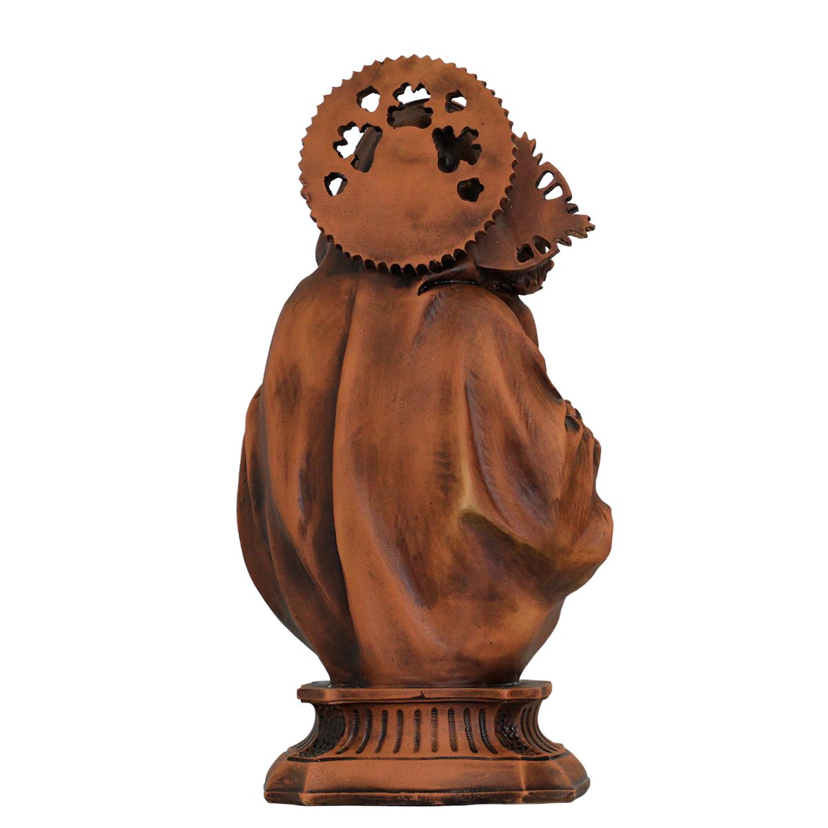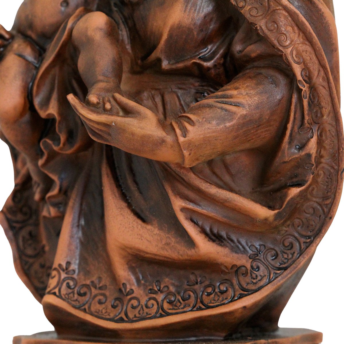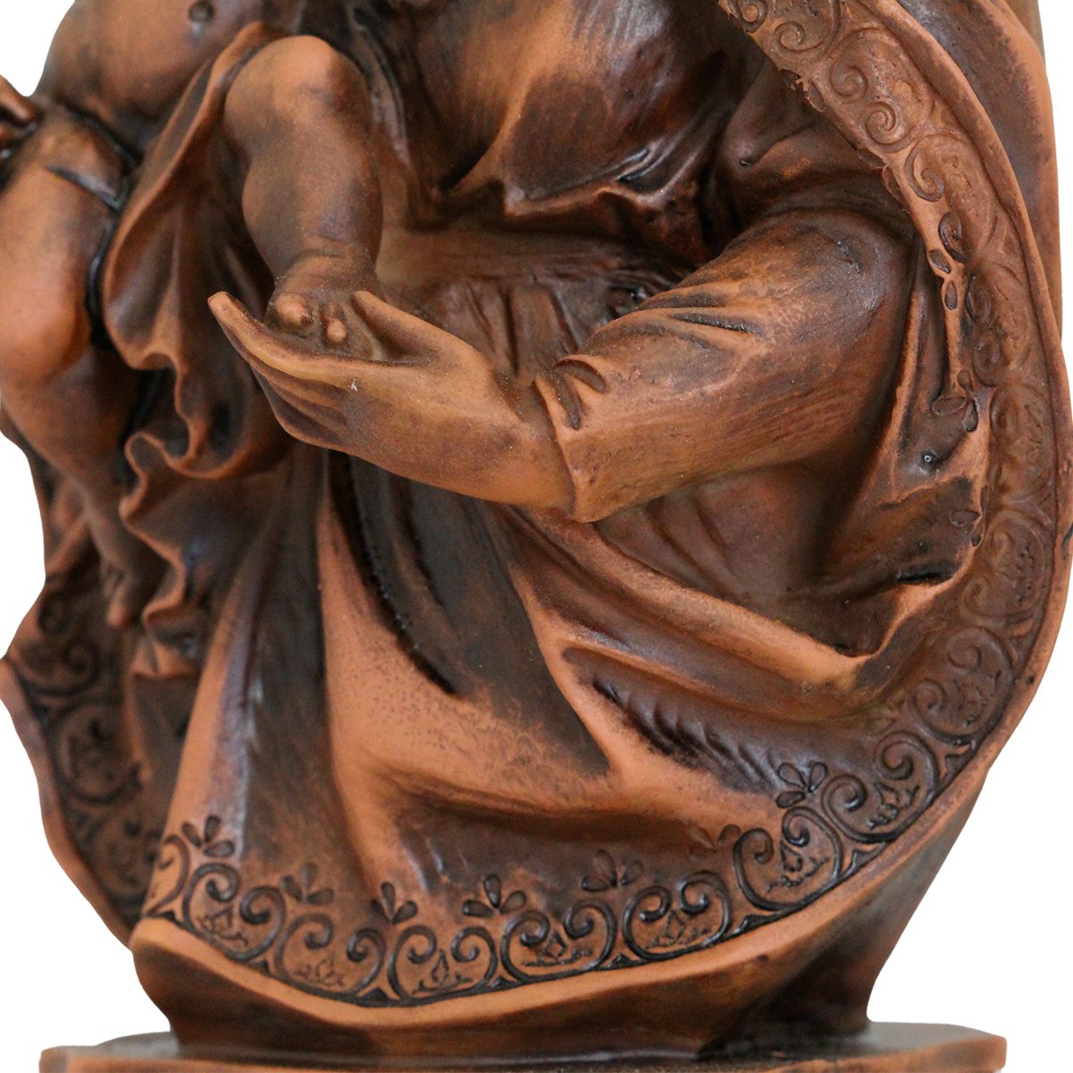 Imagem de Nossa Senhora da Divina Providência de Resina (Efeito Madeira), medindo aproximadamente 34 cm de altura e 17 cm de largura e 11 cm de profundidade.