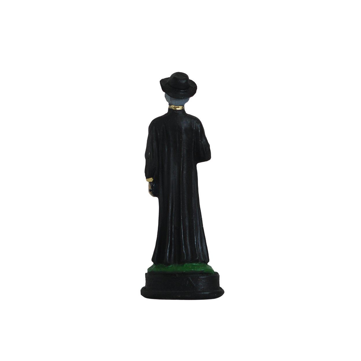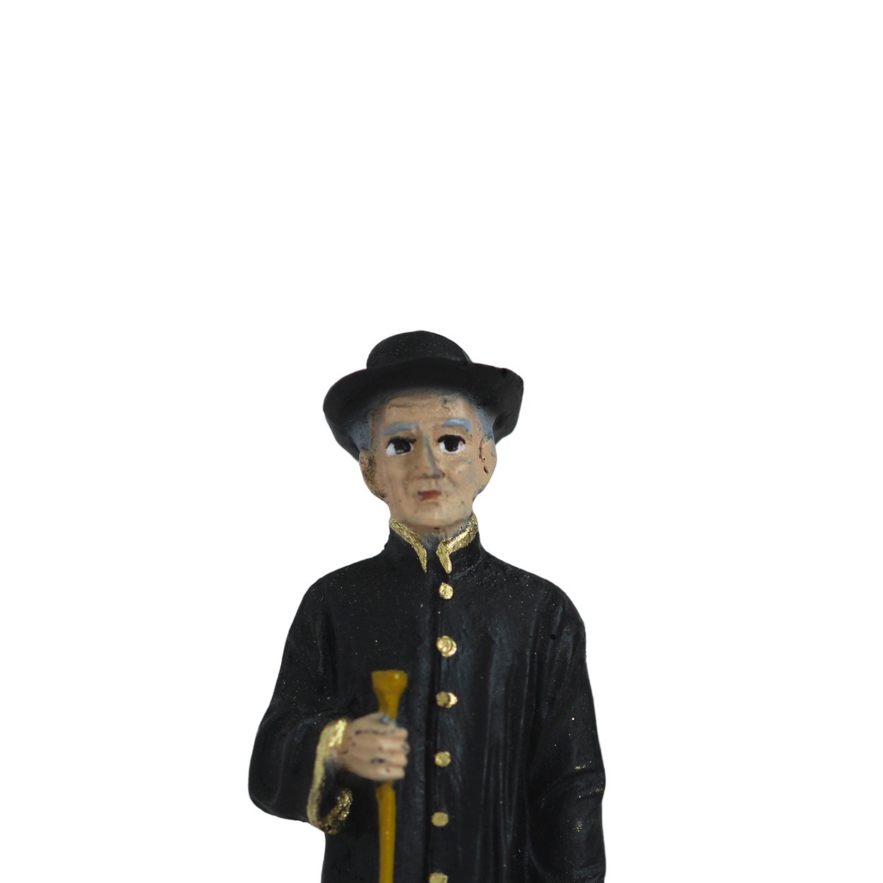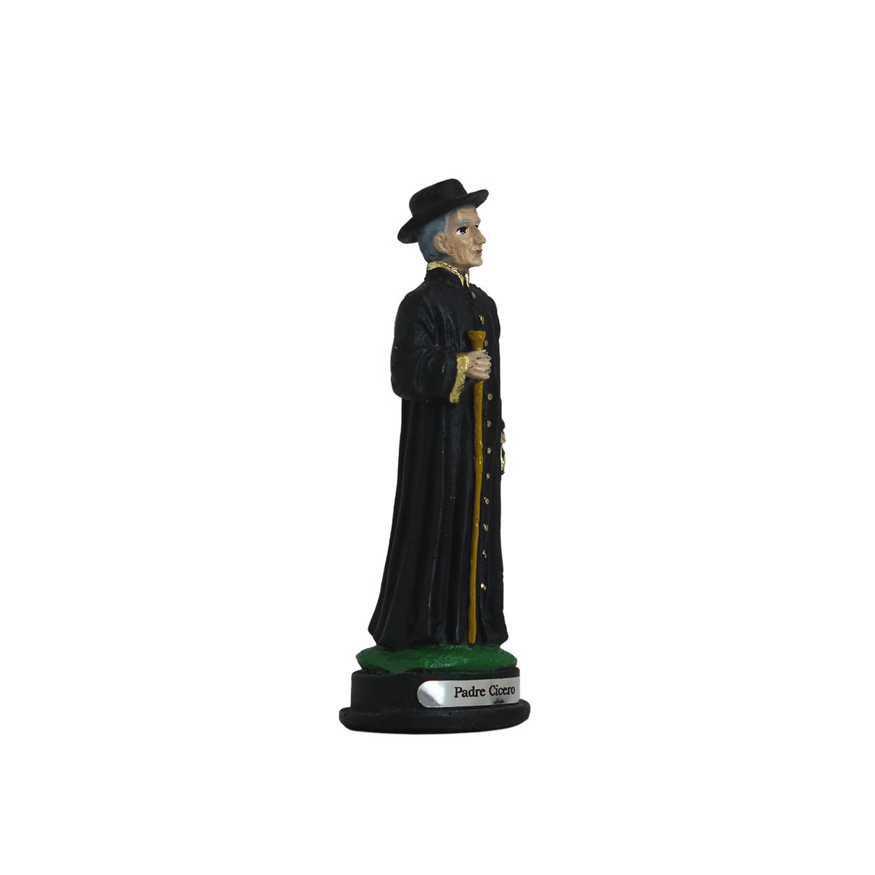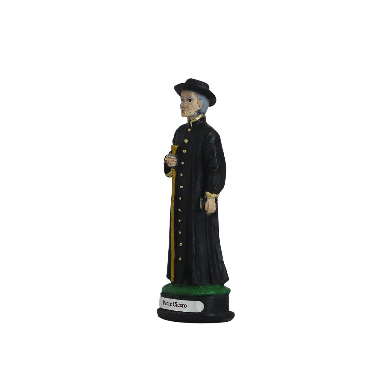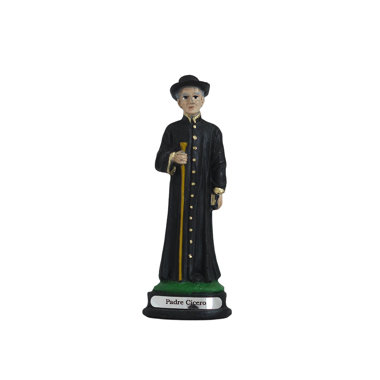 Imagem de Padre Cícero produzida em resina, medindo aproximadamente 11,5cm de altura e 4cm de largura e 3cm de comprimento.