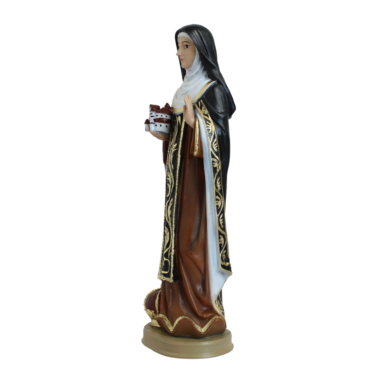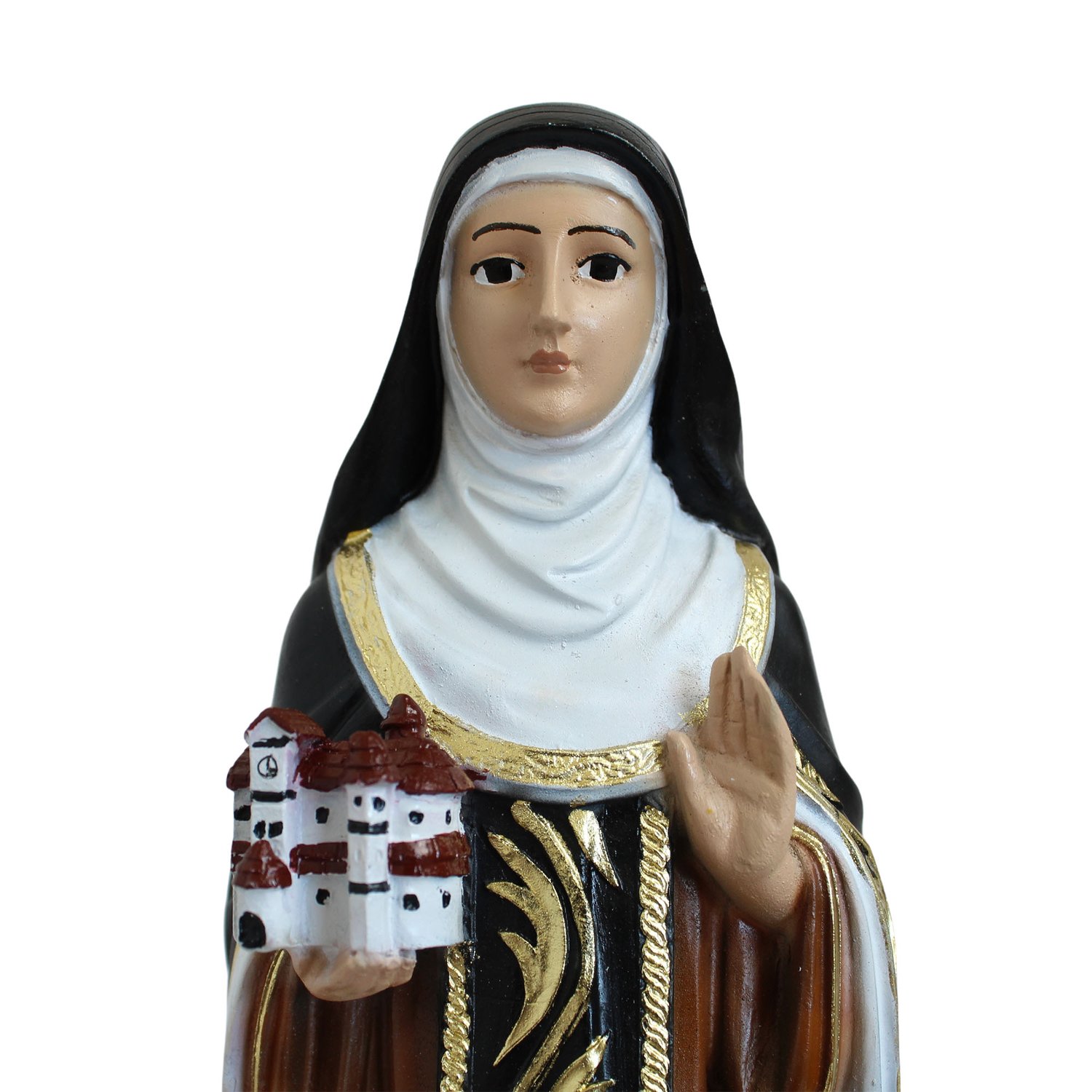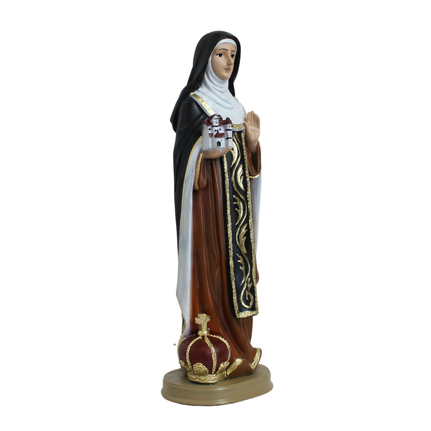 Imagem de Santa Edwiges produzida em resina, hábito branco e preto com detalhes dourado, livro e coroa na mão.
