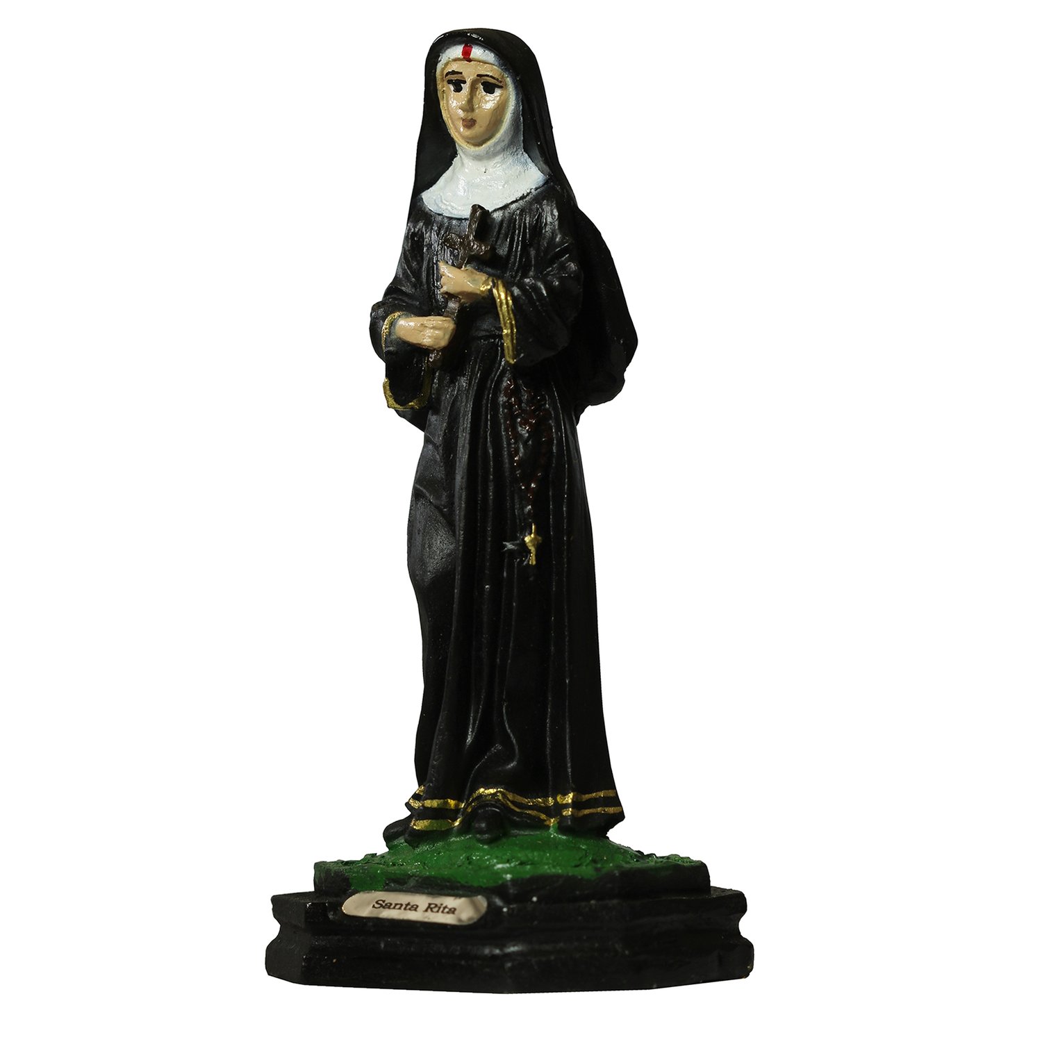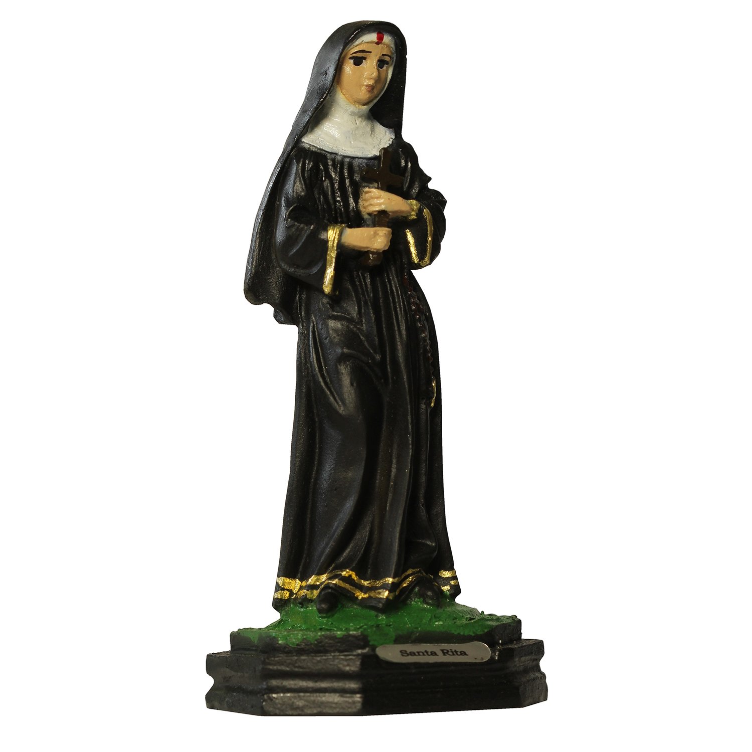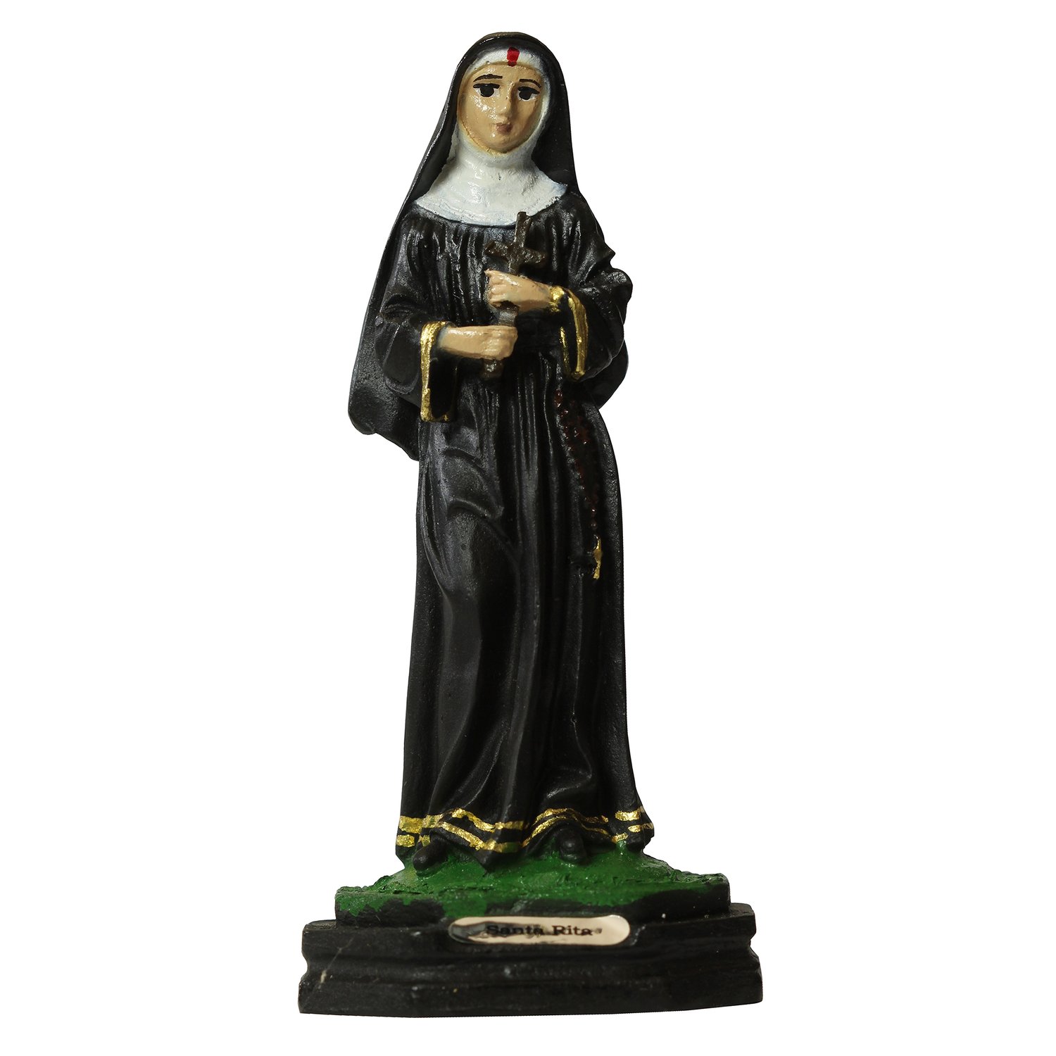 Imagem de Santa Rita produzida em resina, roupa preta com detalhes dourado, véu preto e branco e sinal de ferimento na testa.