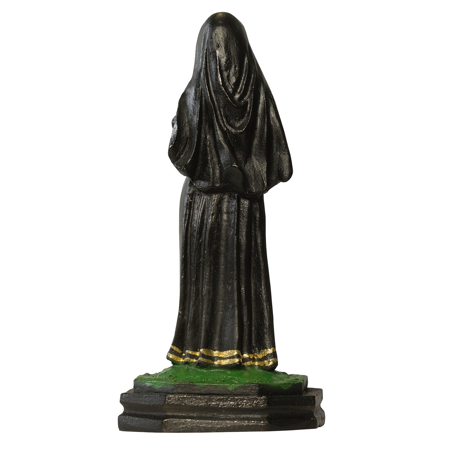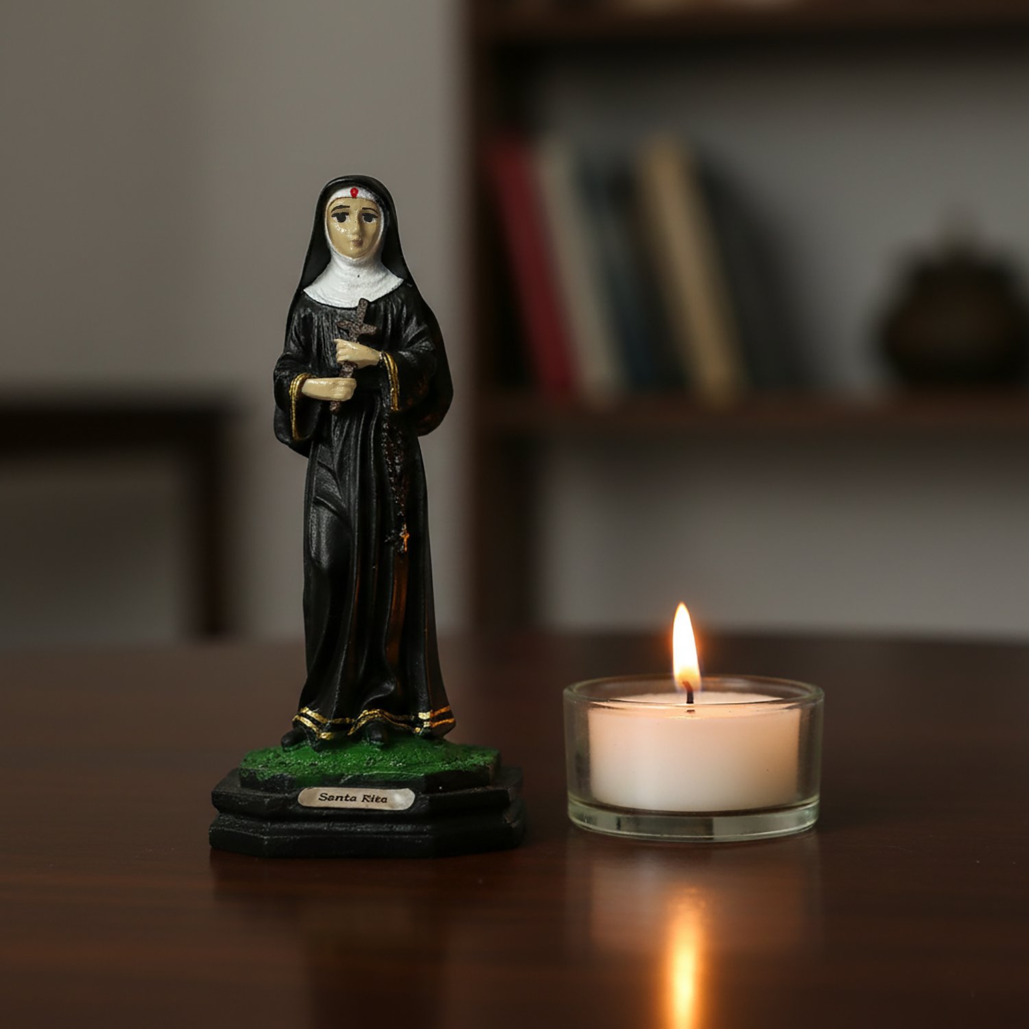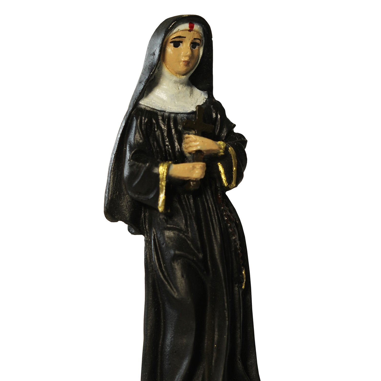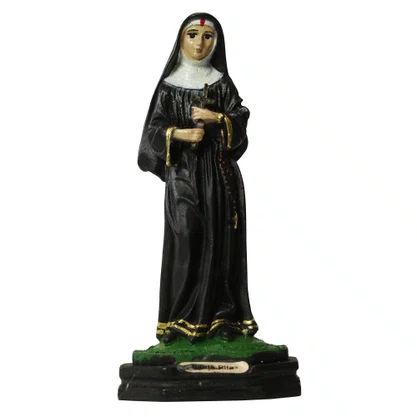 Imagem de Santa Rita produzida em resina, roupa preta com detalhes dourado, véu preto e branco e sinal de ferimento na testa.