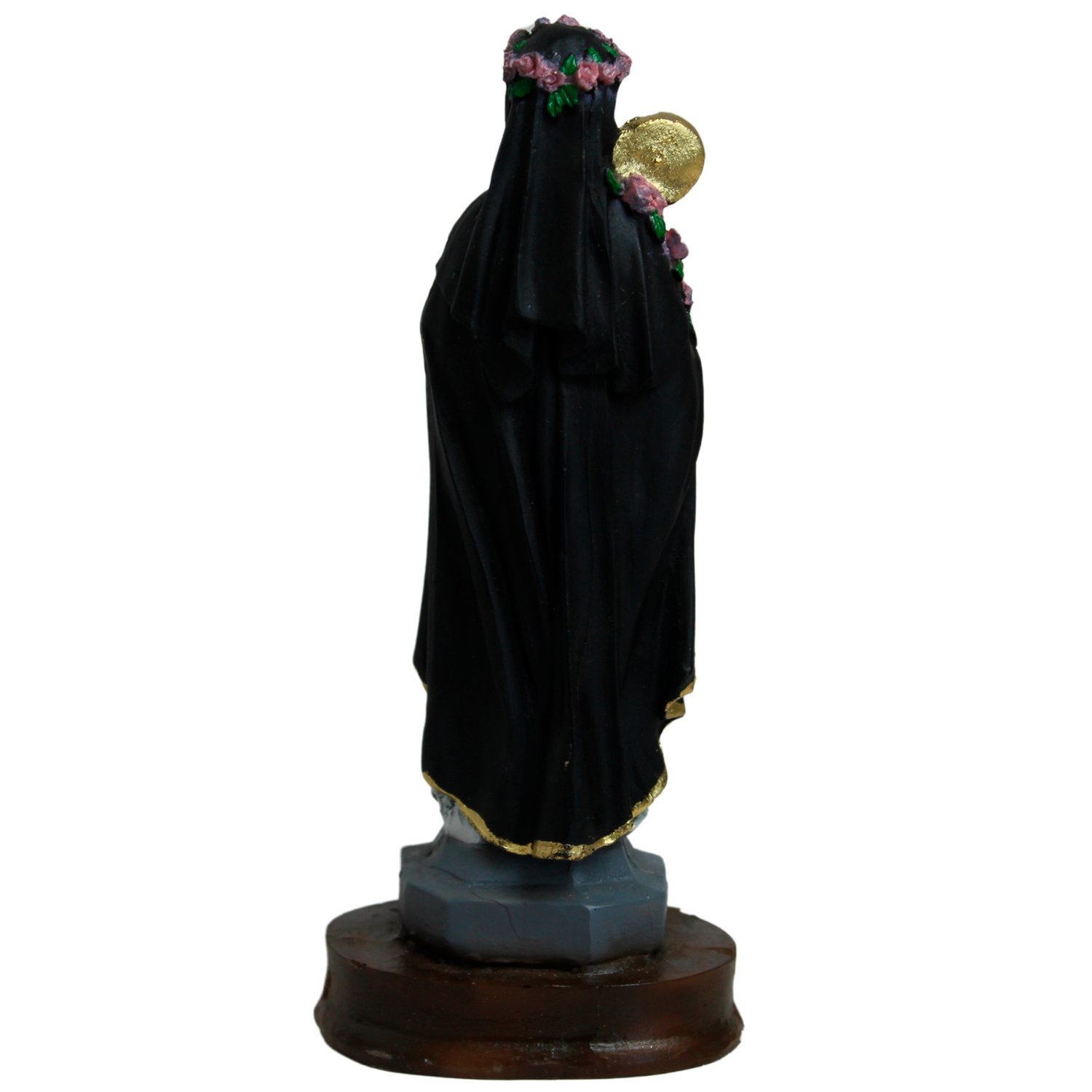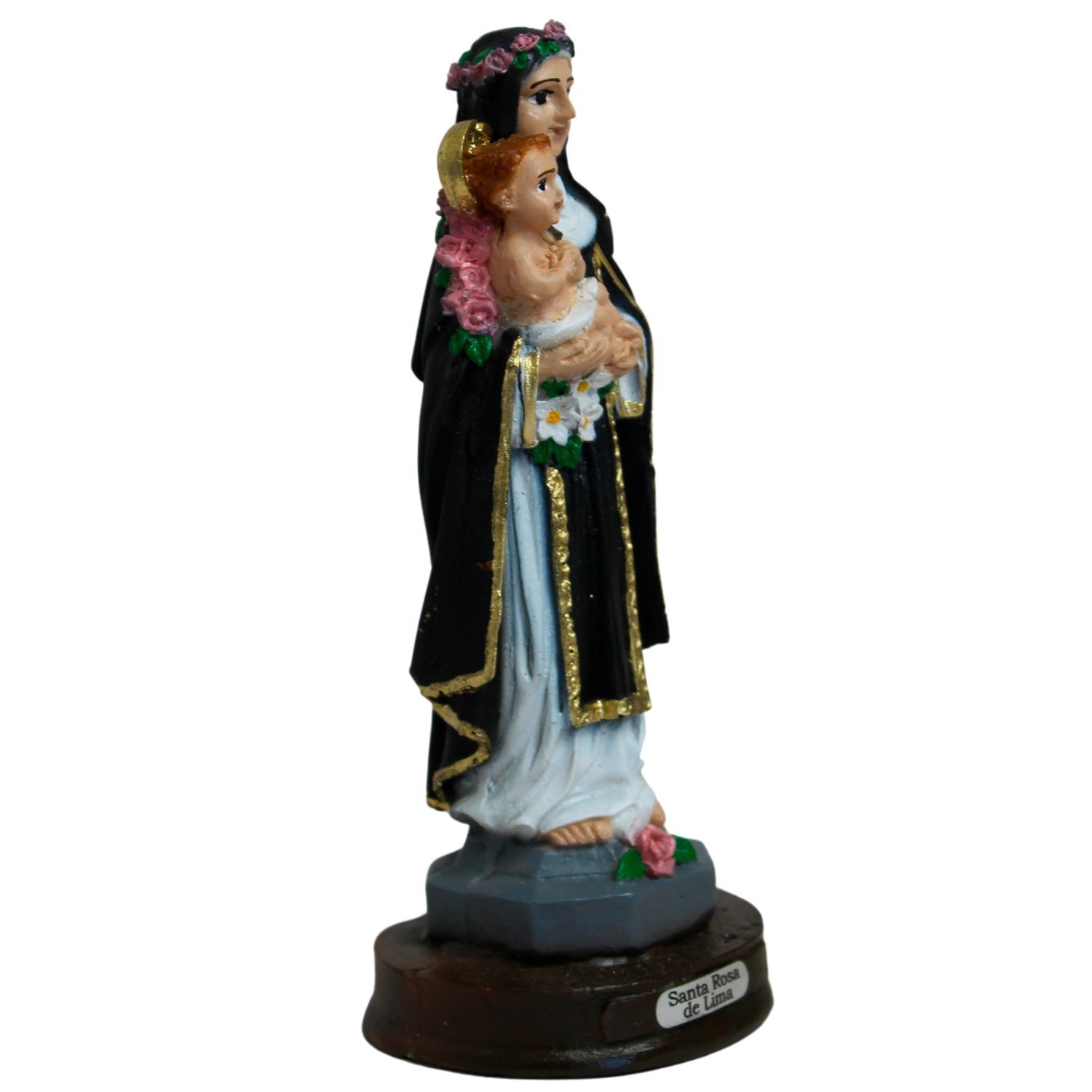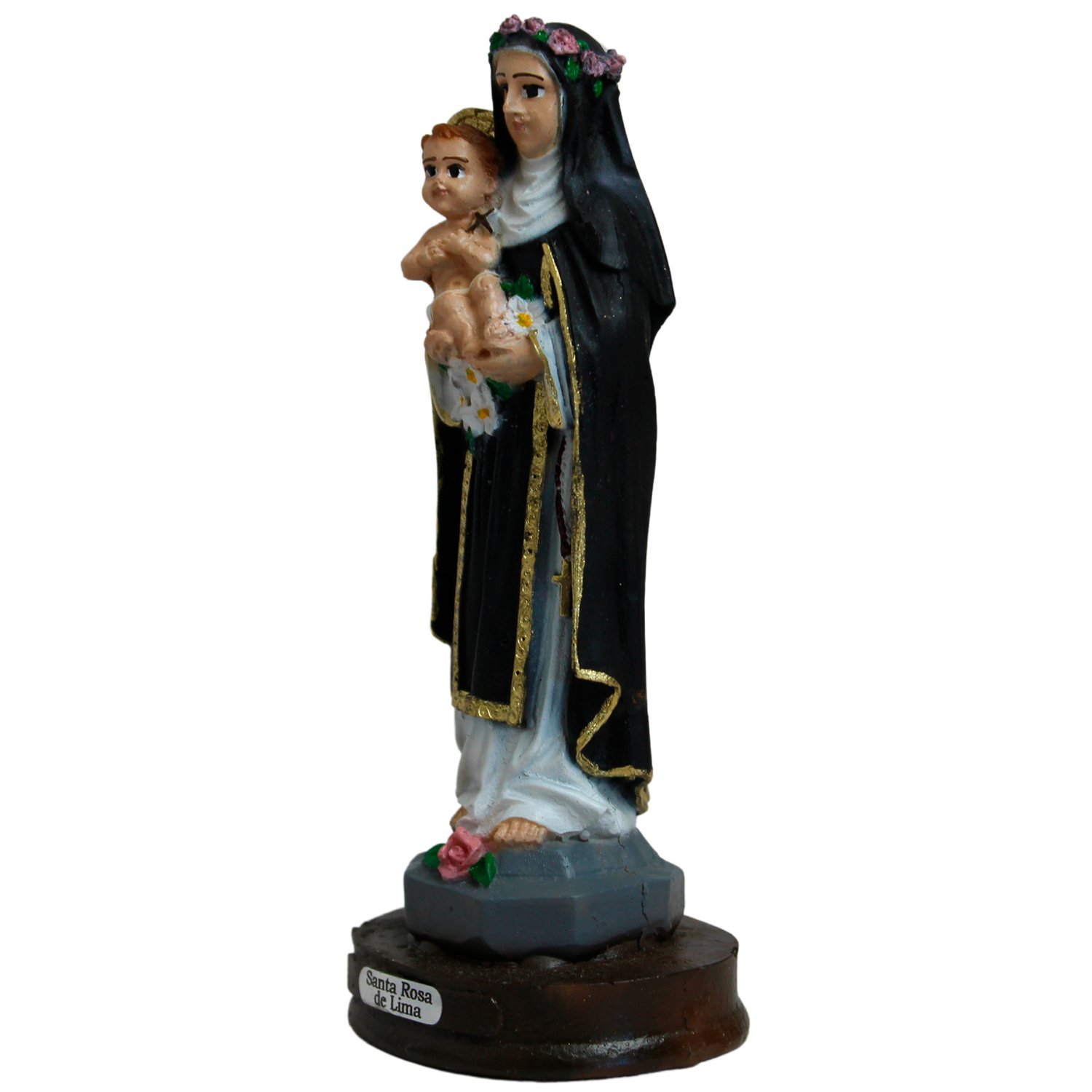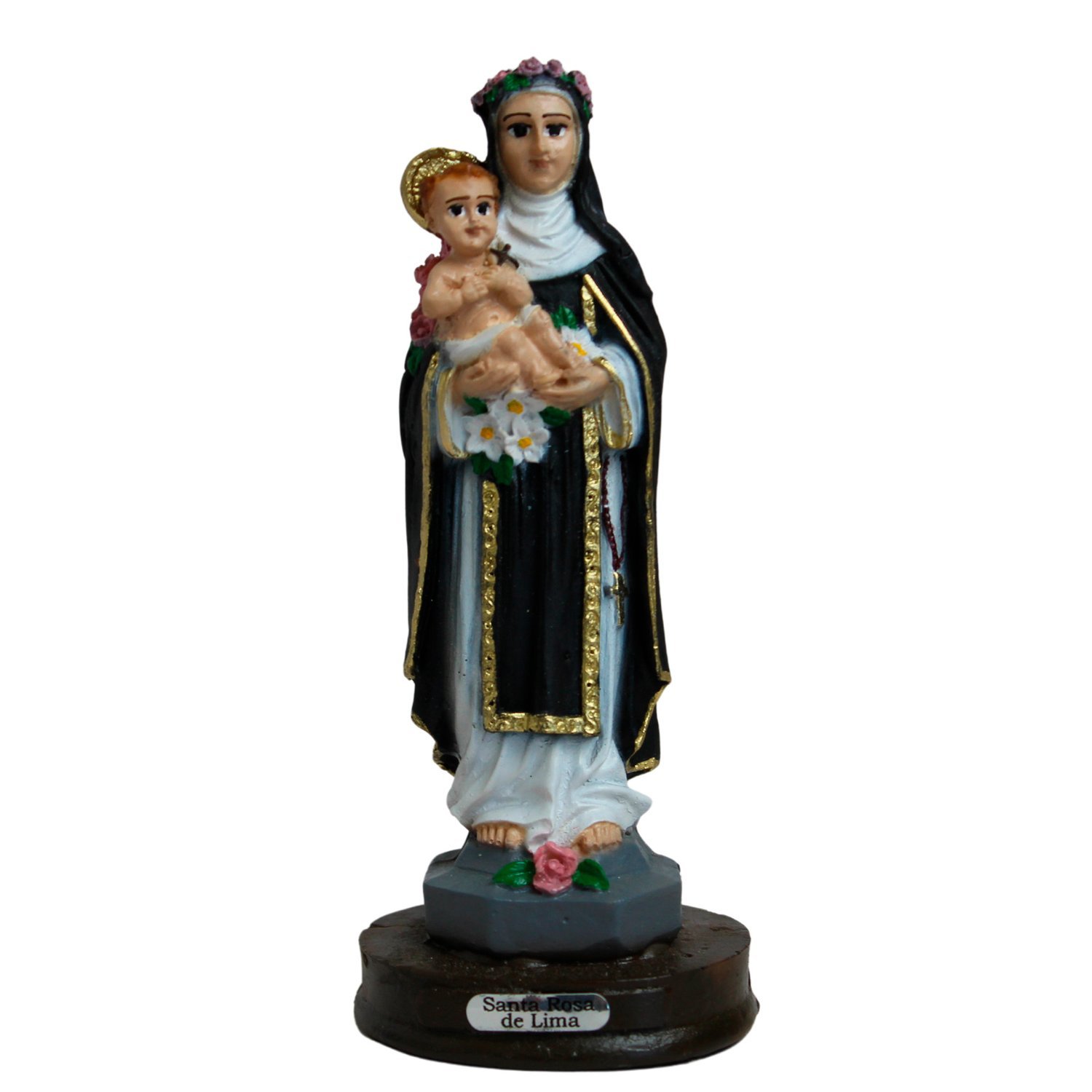 Imagem de Santa Rosa de Lima produzida em resina, medindo aproximadamente 14cm de altura e 5cm de largura e 4cm de comprimento.