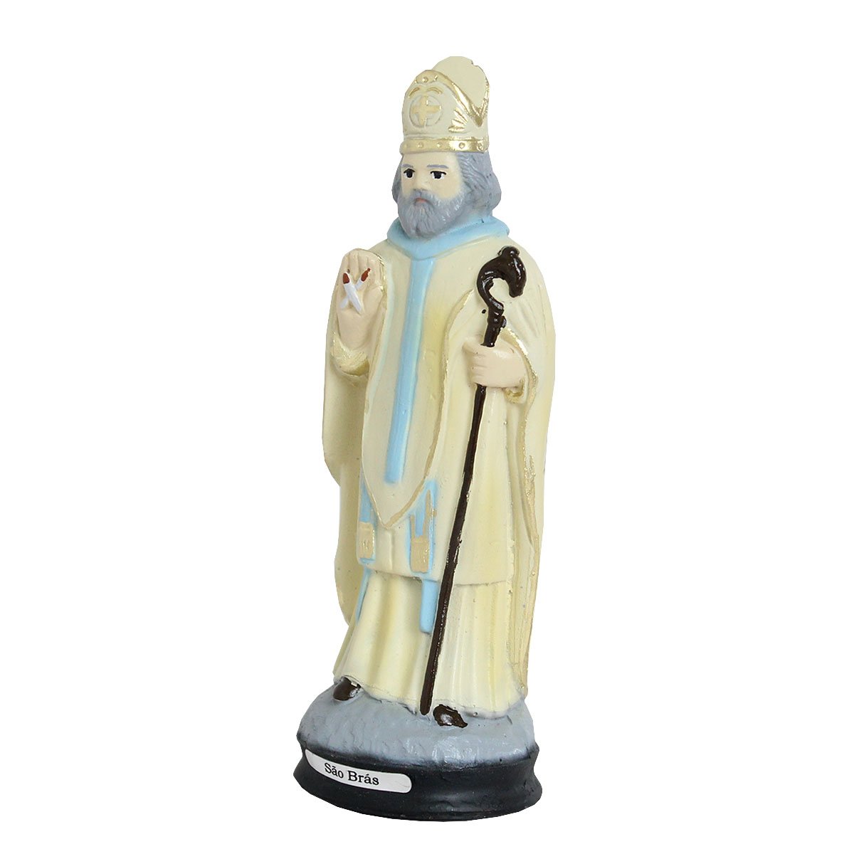 A imagem de São Brás conta importantes detalhes de sua vida. Como podemos ver pela sua vestimenta, ele foi bispo. Bispo de Sebaste, na Armênia. Antes de ser bispo, São Brás foi médico e cristão comprometido. Vamos conhecer os símbolos contidos em sua imagem e, através deles, conhecer um pouco de sua história. A mitra de São Brás simboliza sua missão episcopal. Como bispo, Dom Brás foi o grande líder da igreja de Sebaste, num tempo muito difícil de perseguição contra os cristãos. Neste mundo perseguido, São Brás foi pastor e grande líder espiritual, exercendo dons carismáticos em favor de seu povo, especialmente o dom de cura. São Brás é representado paramentado como bispo, vestindo uma casula vermelha sobre uma túnica verde. A casula vermelha simboliza o sangue dos mártires e o próprio martírio de São Brás. Por causa de sua fé em Jesus Cristo, São Brás foi preso nas montanhas da Armênia, terrivelmente torturado e morto. O médico que dedicou-se a salvar vidas e o bispo que dedicou-se a salvar almas foi descarnado vivo com garfos de ferro e depois decapitado, por não prestar culto aos deuses romanos e não renunciar à sua fé em Cristo. A túnica verde de São Brás é a túnica litúrgica do tempo comum. Além disso, ela representa a vida que vence a morte em Cristo. Ao enfrentar a morte por causa de Jesus Cristo, São Brás recebeu a coroa da vitória no céu. Sua vida venceu a morte e sua memória permaneceu pelos Séculos. A mão direita de São Brás abençoando relembra o gesto que ele tanto usava quando rezava pelos doentes. Através de sua bênção muitos doentes ficavam curados e muitas graças aconteciam. As velas na mão esquerda de São Brás, amarradas e em formato de cruz simbolizam a bênção do santo bispo e relembram um fato extraordinário acontecido em sua vida. Uma mãe chegou até ele aflita, apresentando-lhe o filho agonizante, engasgado com uma espinha de peixe. São Brás abençoou o menino e retirou-lhe o espinho. O menino ficou bom imediatamente. Por causa disso, São Brás passou a ser invocado como o protetor da garganta. No dia e sua festa, celebrada em 03 de fevereiro, os sacerdotes dão a benção da garganta com duas velas em cruz, pedindo a intercessão de São Brás
