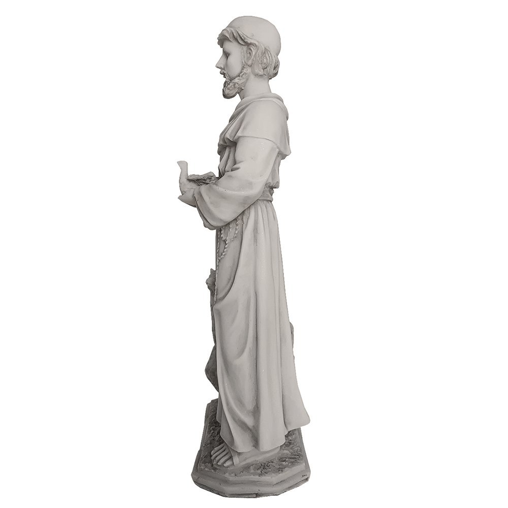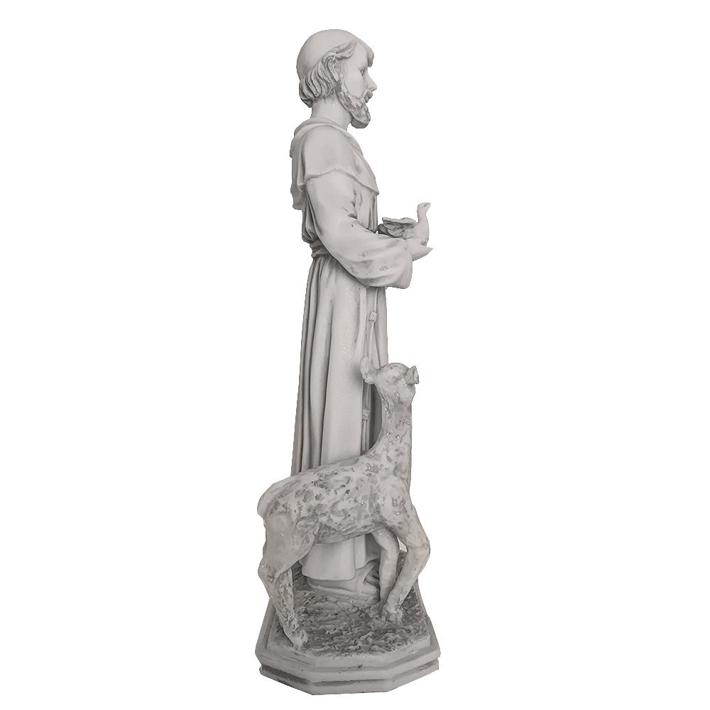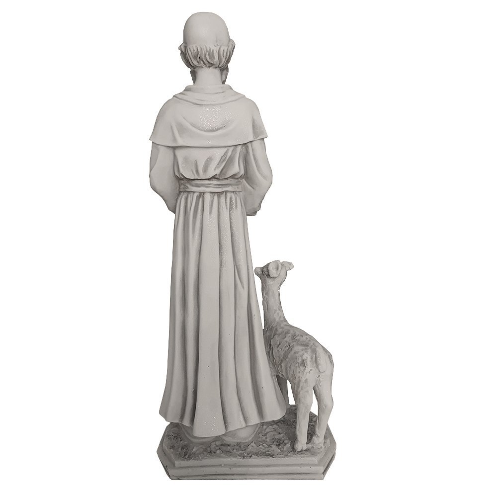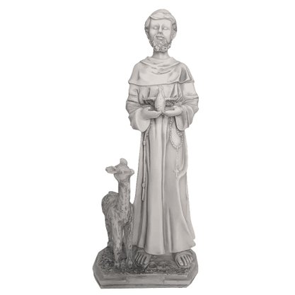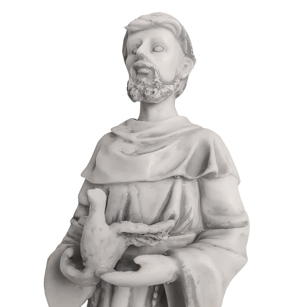 Imagem de São Francisco de Assis com cervo e pomba produzida em pó de Mármore, uma peça que transmite requinte e sofisticação, rica em detalhes, material sinônimo de elegância. Resistente a intempéries, pode ser usada de forma externa, como em Igrejas, mausoléus, túmulos e jardins.O mármore é uma boa opção para quem deseja decorar de forma única. O mármore é uma boa opção para quem deseja decorar de forma única. Fabricação própria.