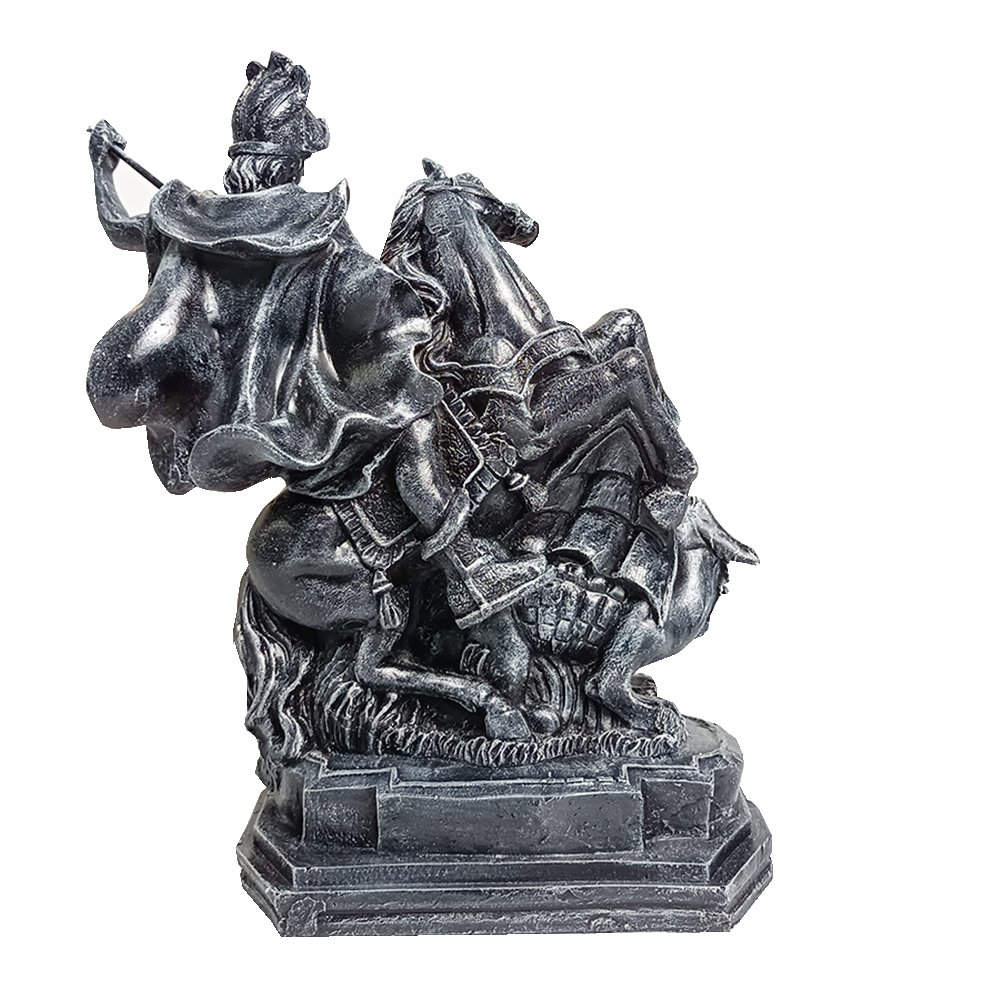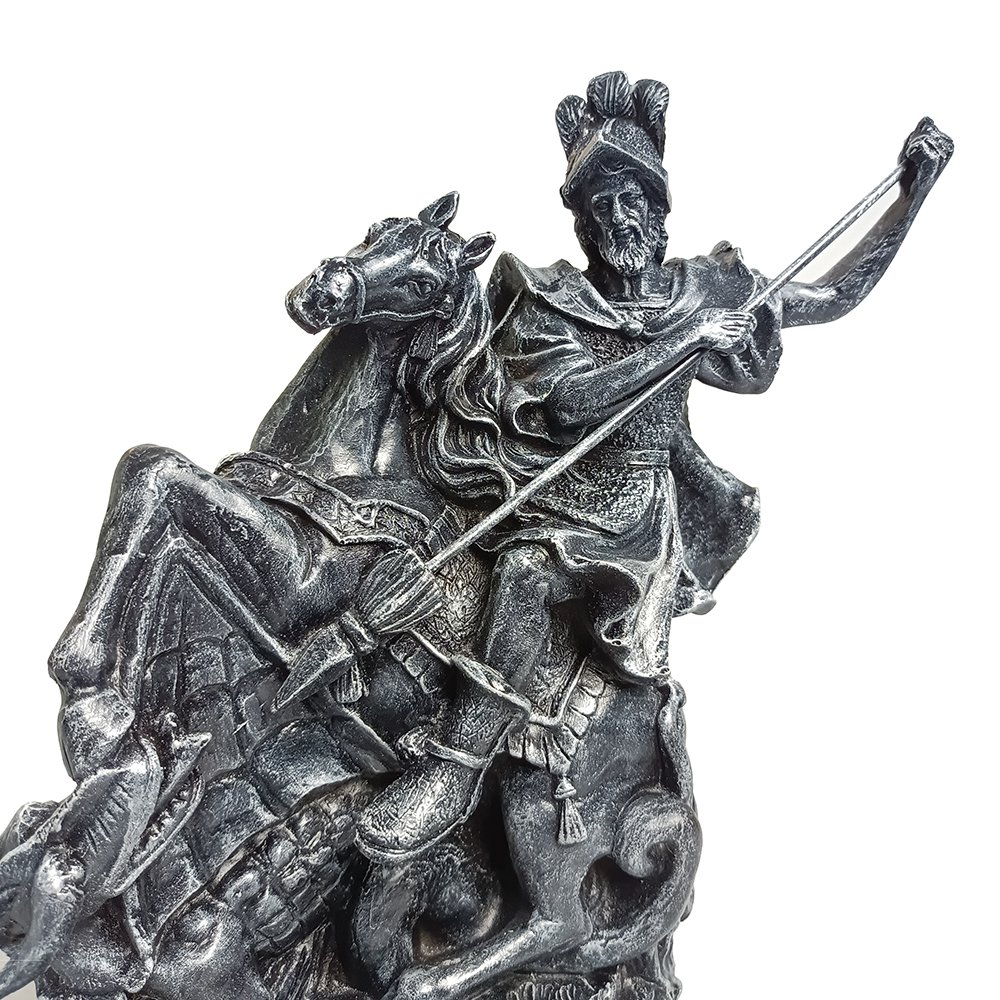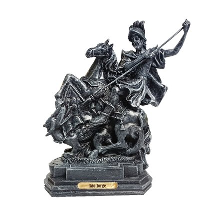 Imagem de São Jorge produzida em resina, a peça possui traços delicados, riqueza de detalhes e excelente acabamento.