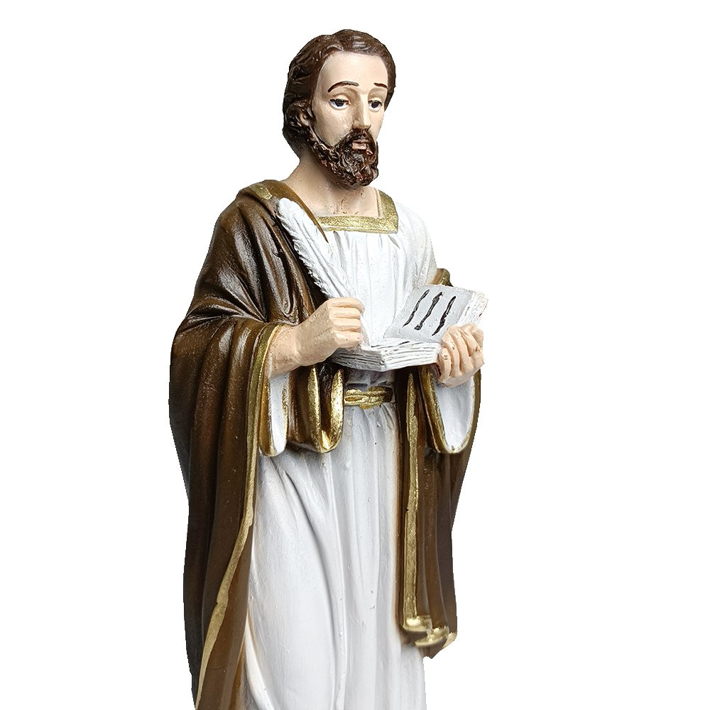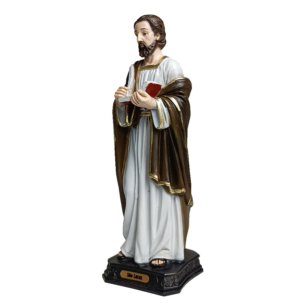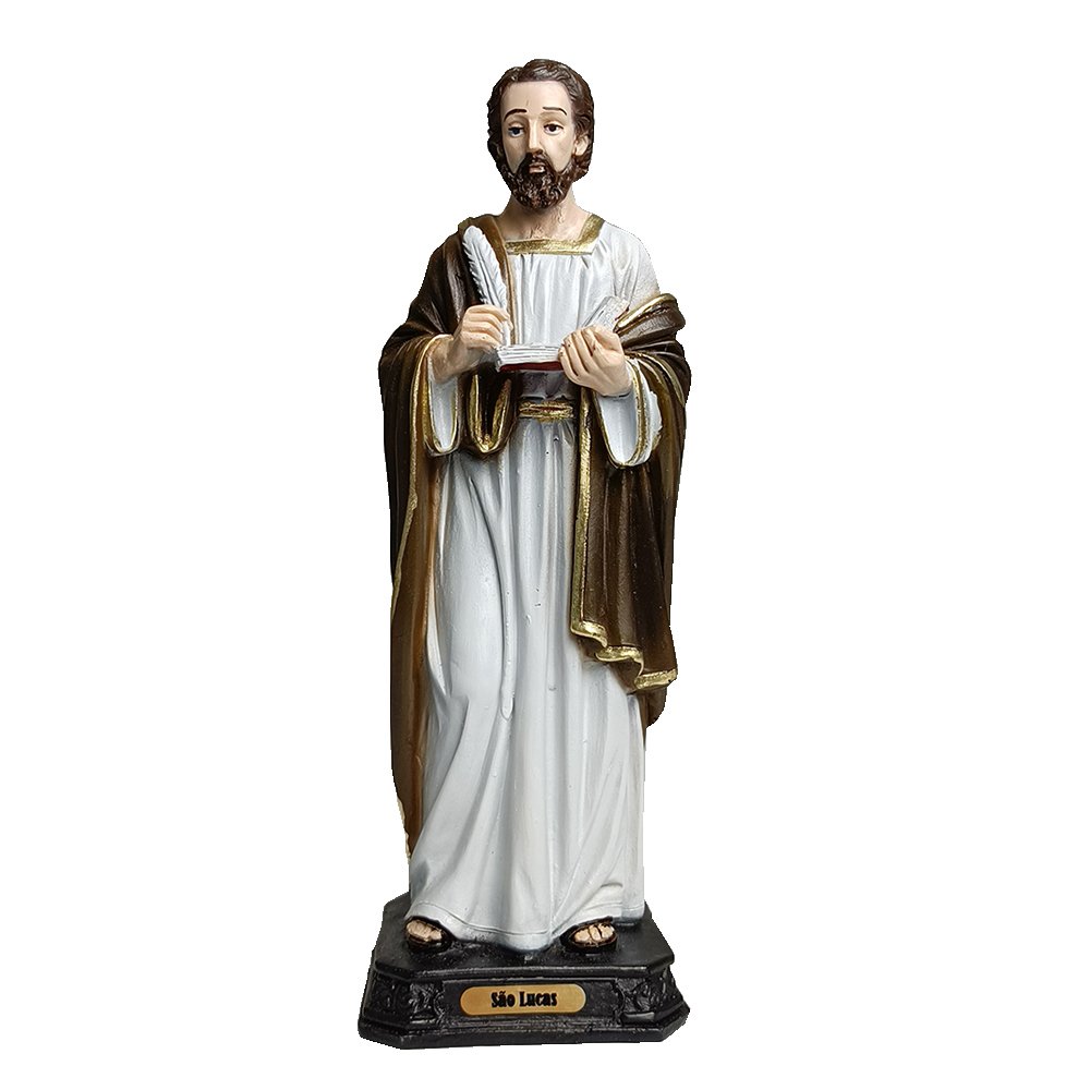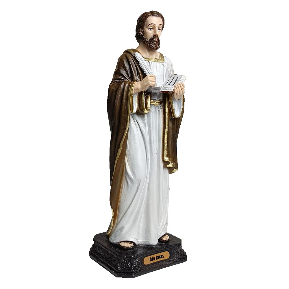 Imagem de São Lucas produzida em resina, a peça possui traços delicados, riqueza de detalhes e excelente acabamento.