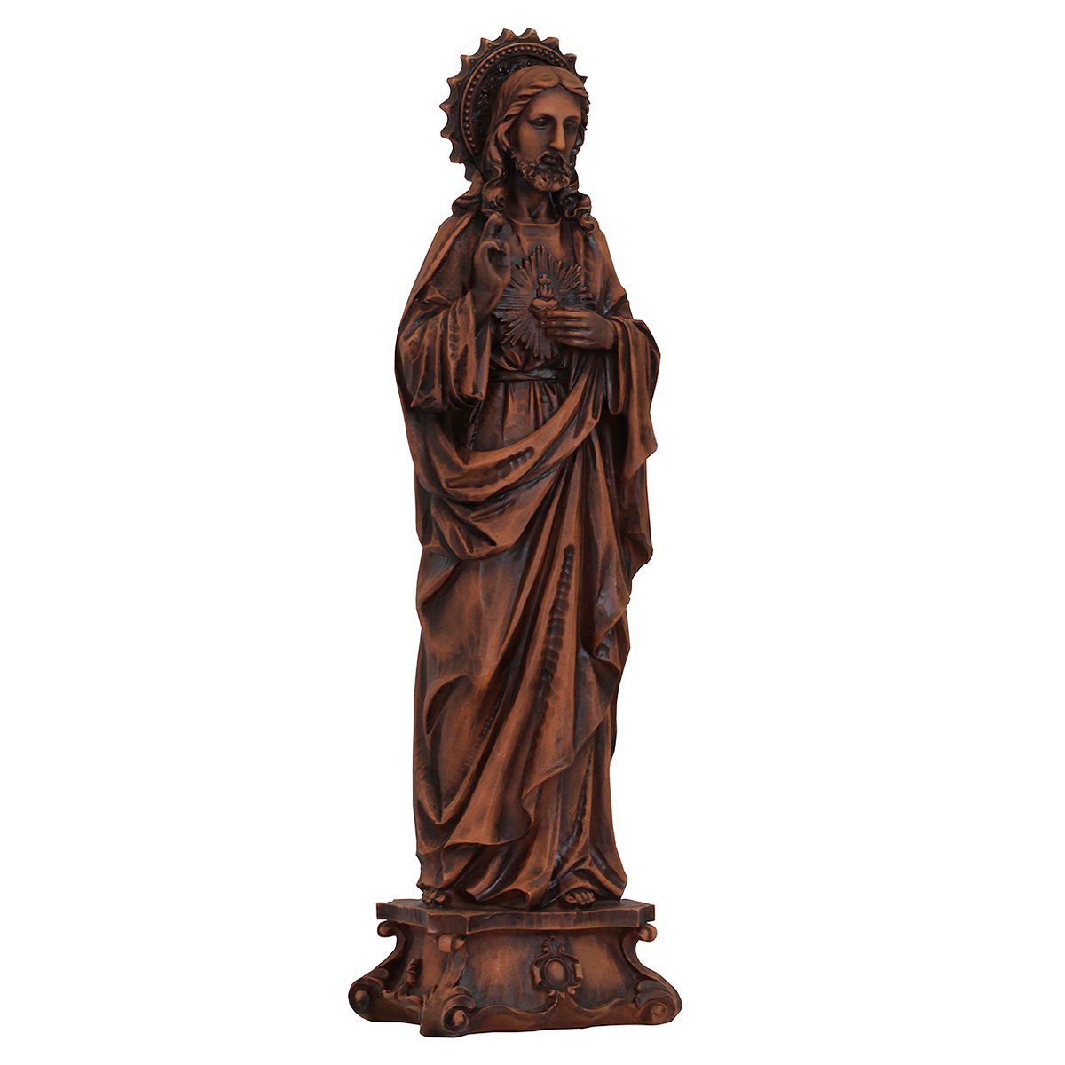 Imagem de Sagrado Coração de Jesus de resina (Efeito Madeira), medindo aproximadamente 57 cm de altura e 18 cm de largura e 15cm de profundidade.