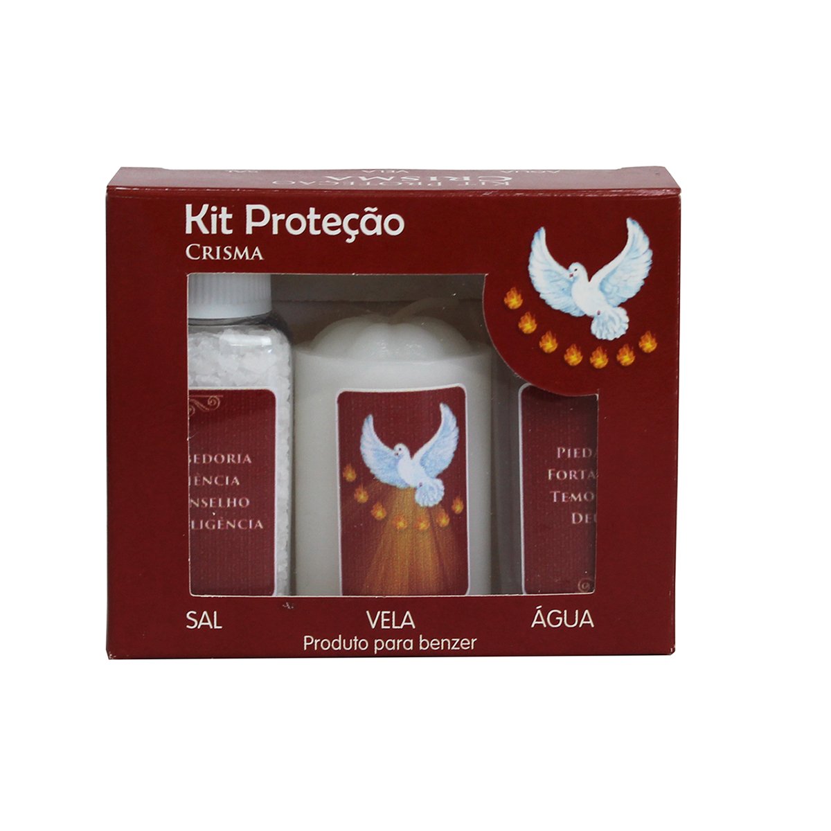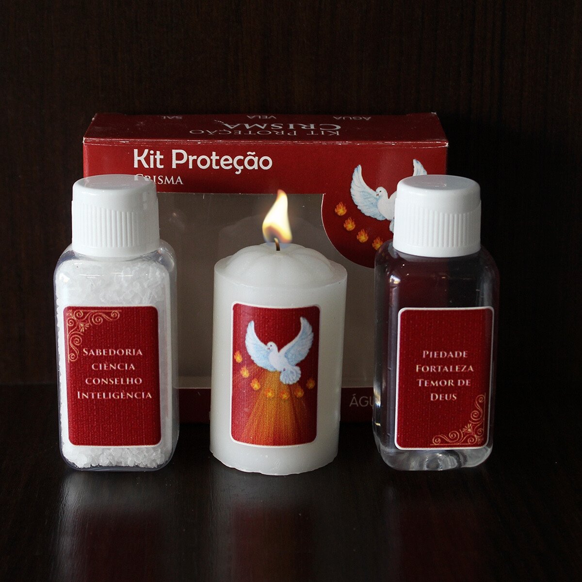 Kit Proteção de Crisma, com oração no verso. Contém 1 vela, 1 frasco com água e 1 frasco com sal grosso