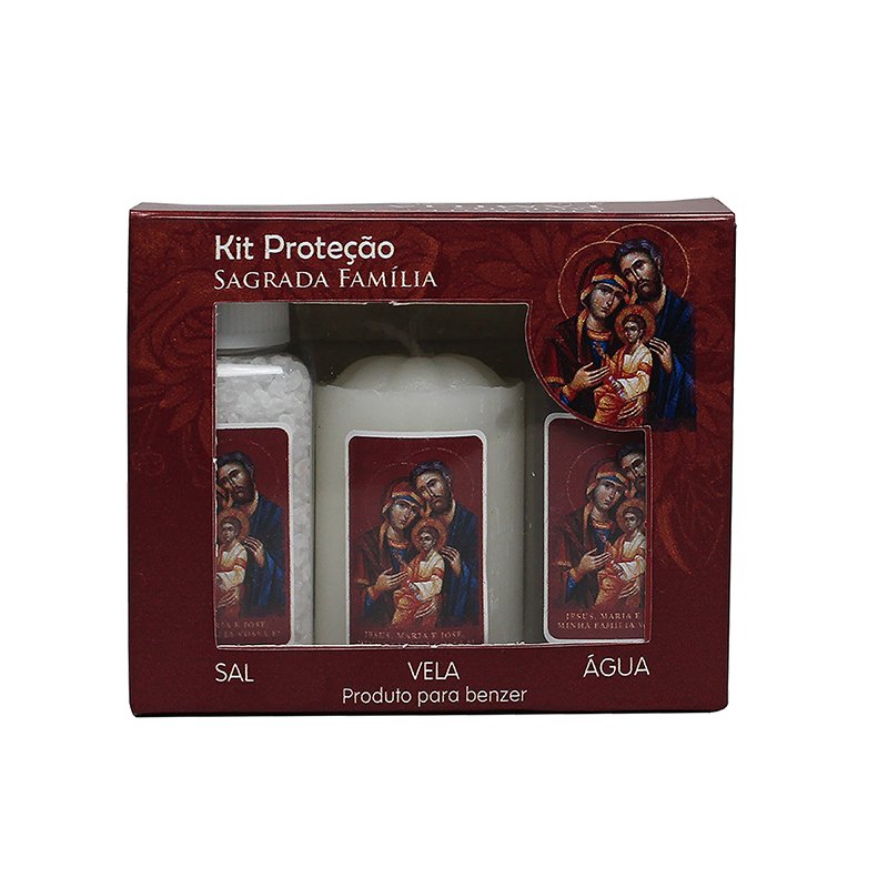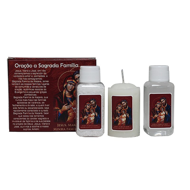 Kit Proteção Sagrada Família, com oração no verso. Contém 1 vela, 1 frasco com água e 1 frasco com sal grosso