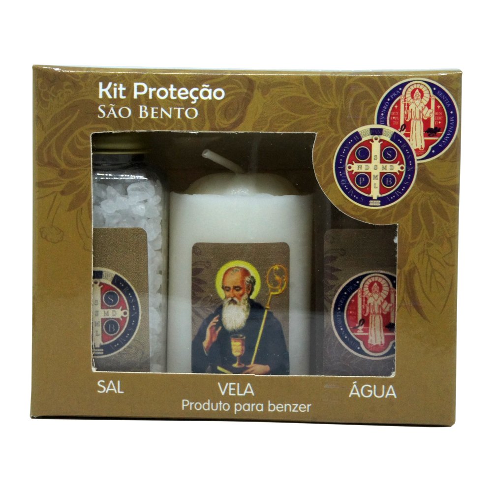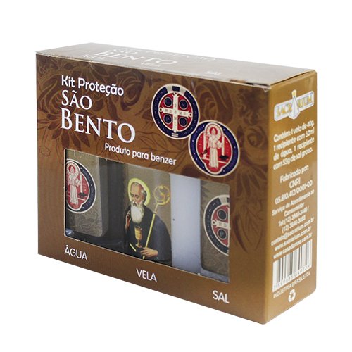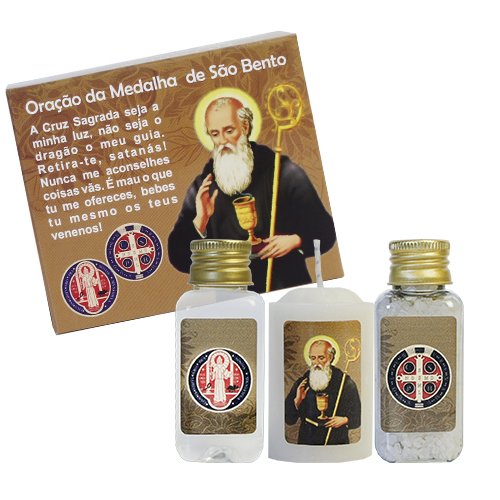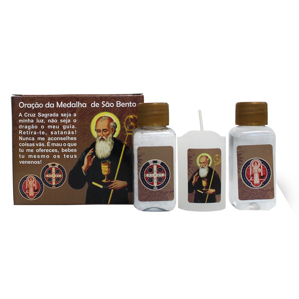Kit Proteção de São Bento, com oração no verso. Contém 1 vela, 1 frasco com água e 1 frasco com sal grosso