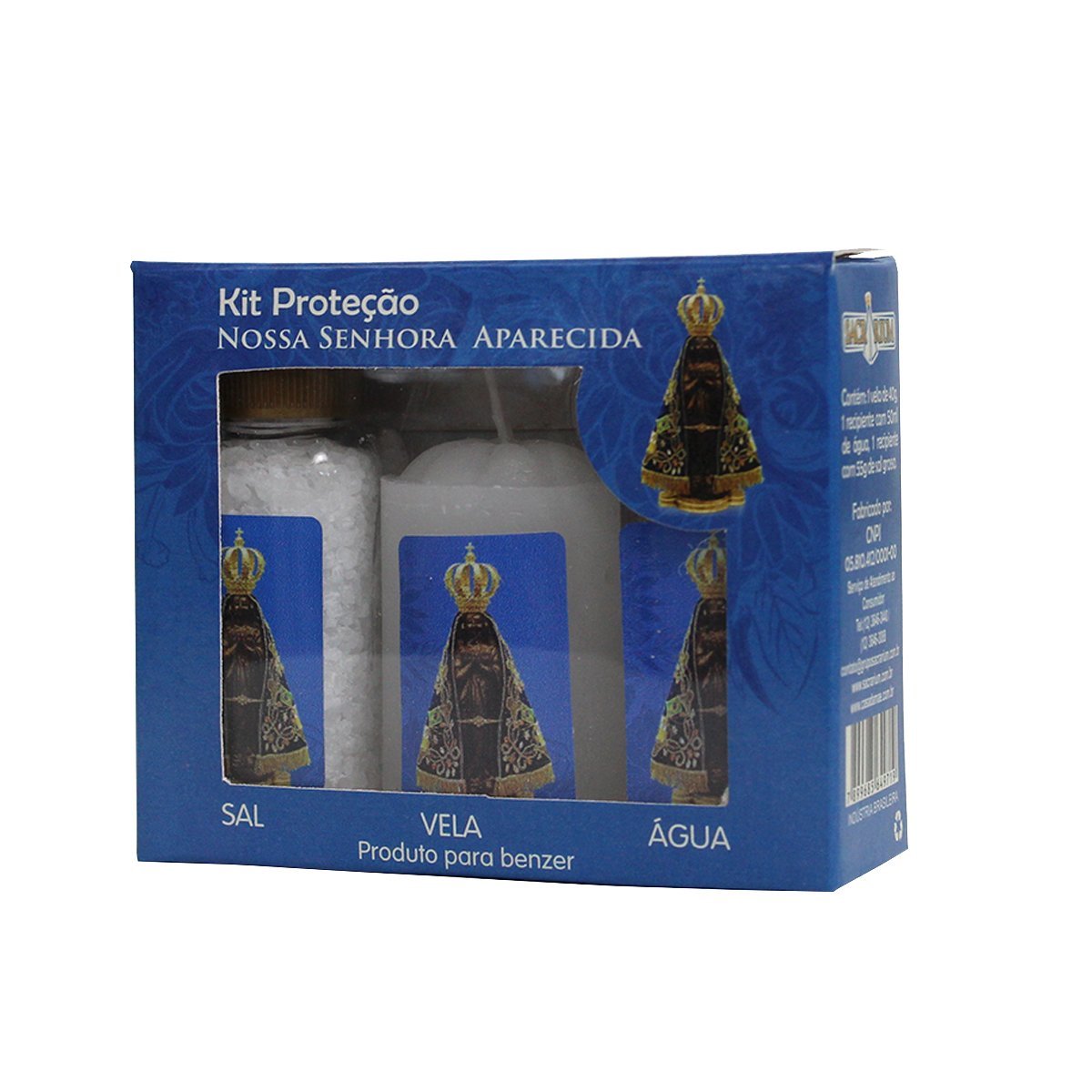 Kit Proteção de Nossa Senhora Aparecida, com oração no verso. Contém 1 vela, 1 frasco com água e 1 frasco com sal grosso.