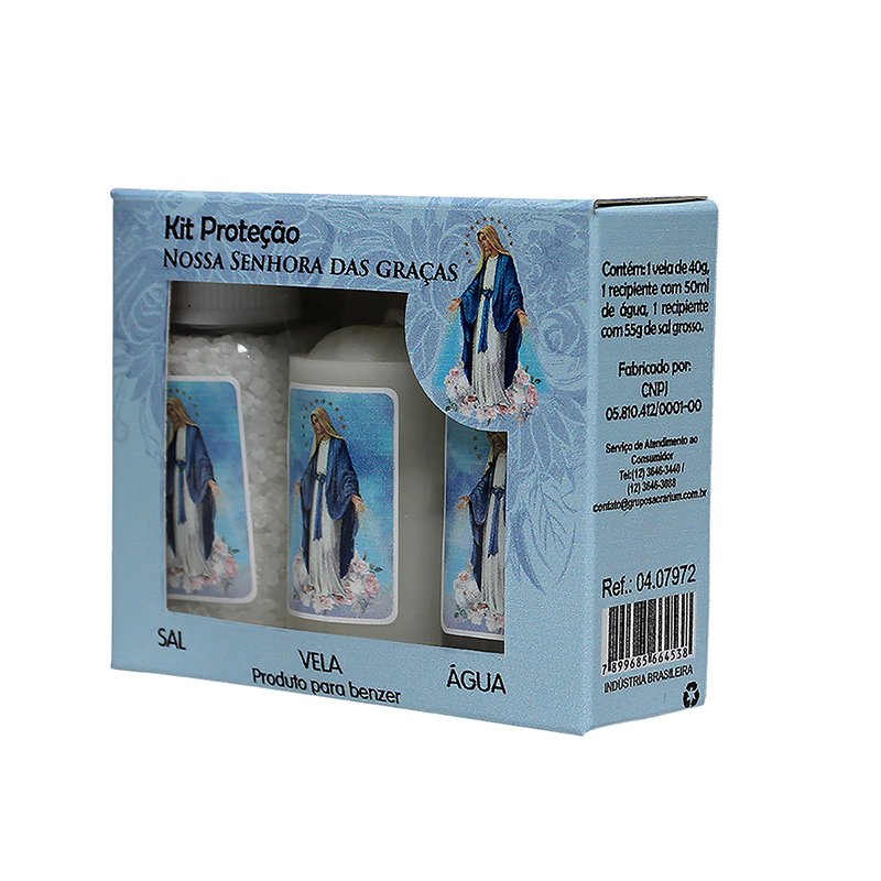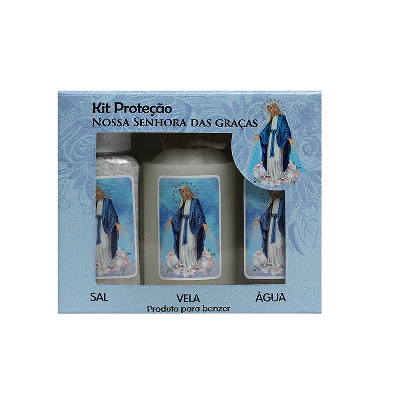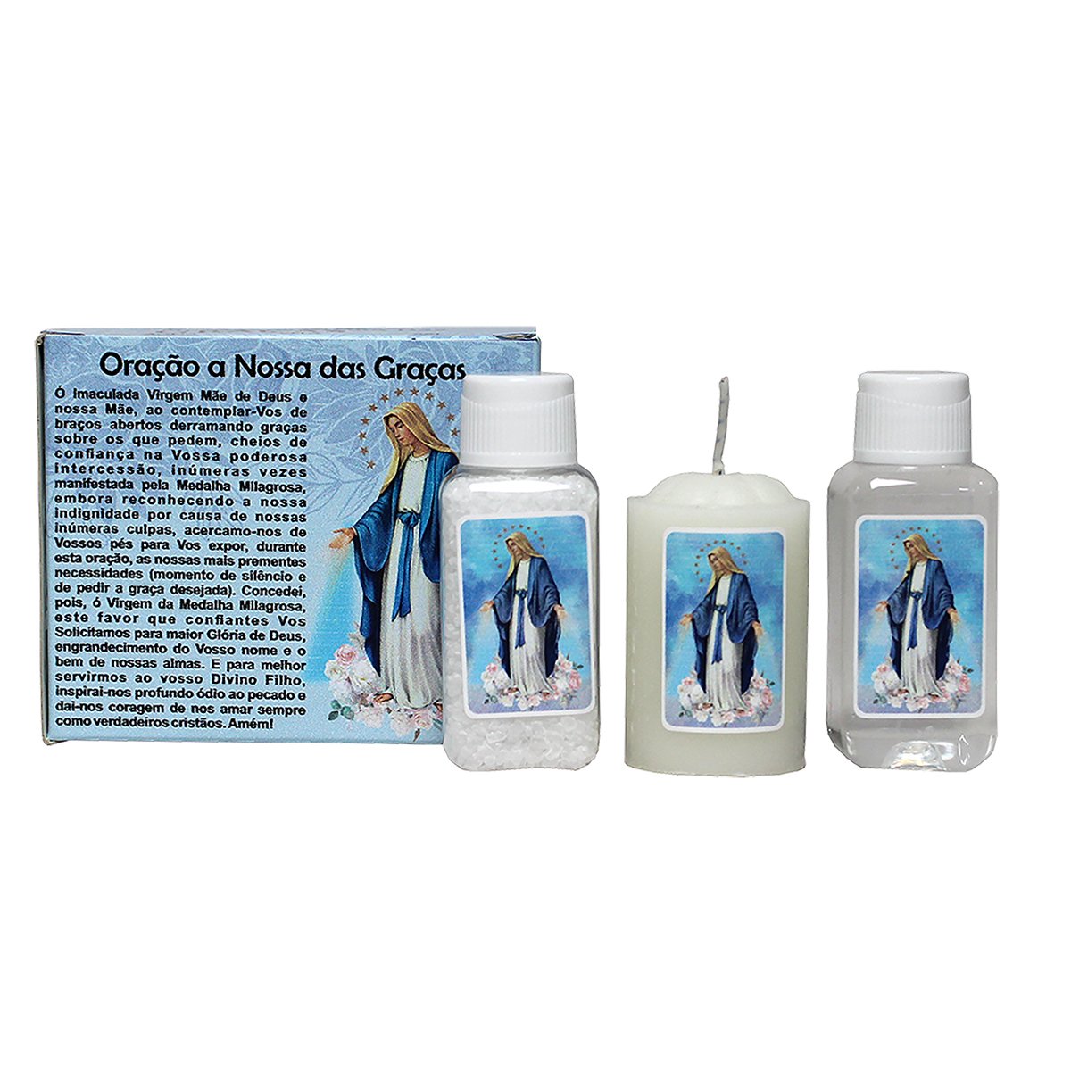 Kit Proteção de Nossa Senhora das Graças, com oração no verso. Contém 1 vela, 1 frasco com água e 1 frasco com sal grosso