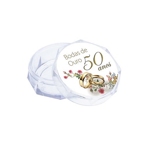 Caixa acrílica com adesivo temático contendo uma dezena dourada. A caixinha possui 3 cm de diâmetro.