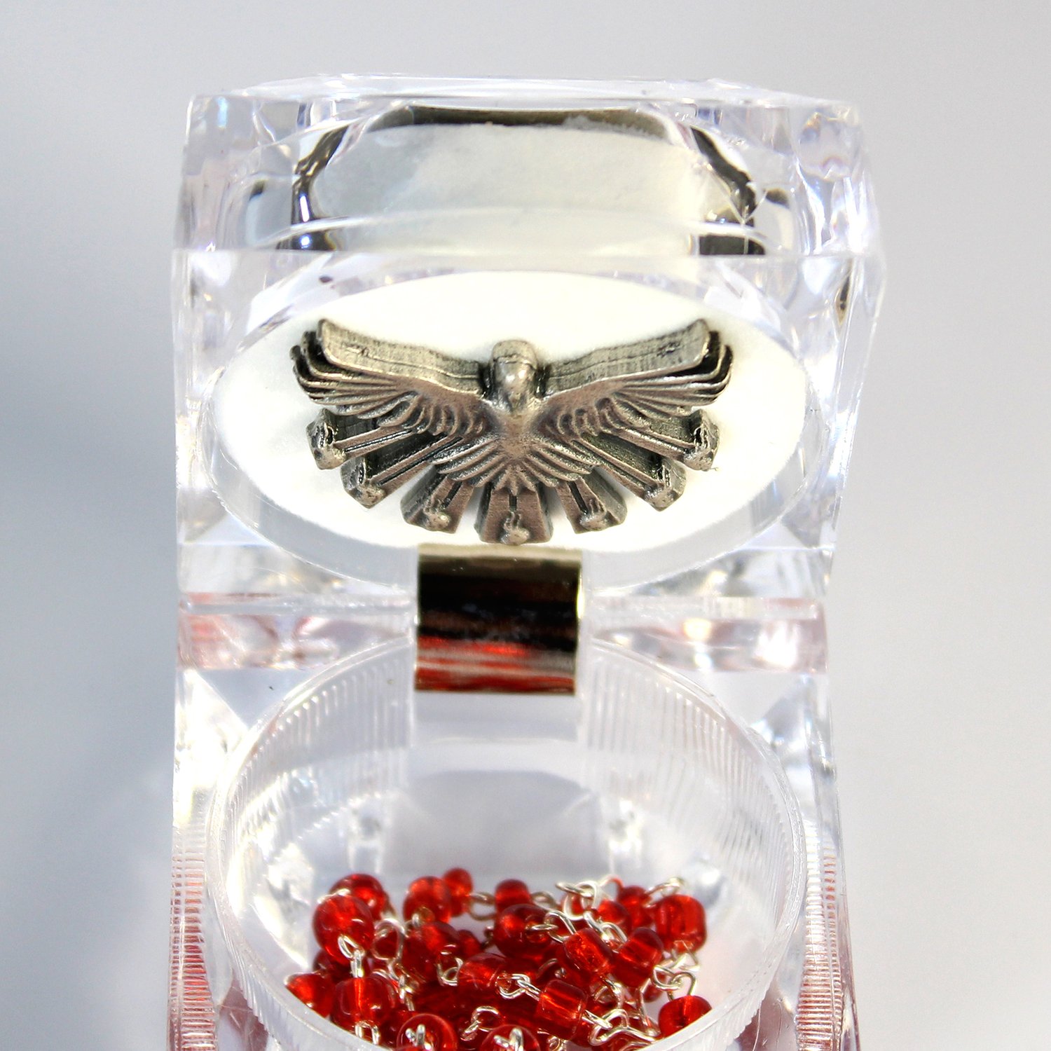 Caixa acrílica Crisma contendo um terço pérola com entremeio Crisma.