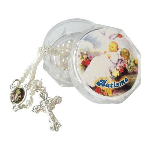 Caixa acrílica com adesivo Batismo contendo Terço em contas de pérola branca 3mm metais em prateado, entremeio do Anjo da Guarda resinado ideal para lembrancinhas. Dimensões aproximadas: 17cm. Crucifixo: 2 x 1,3cm; Entremeio:1 cm.