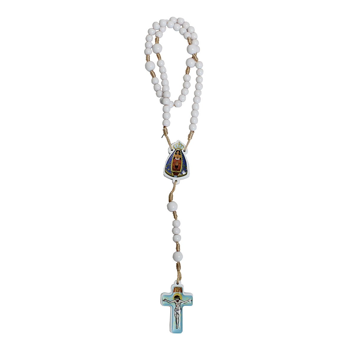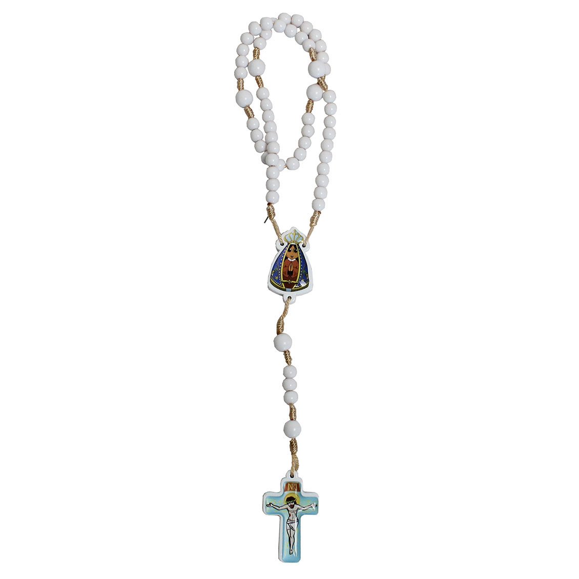 As páginas trazem ilustrações para colorir e o livro acompanha um terço infantil.