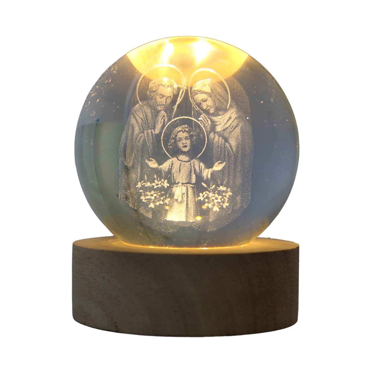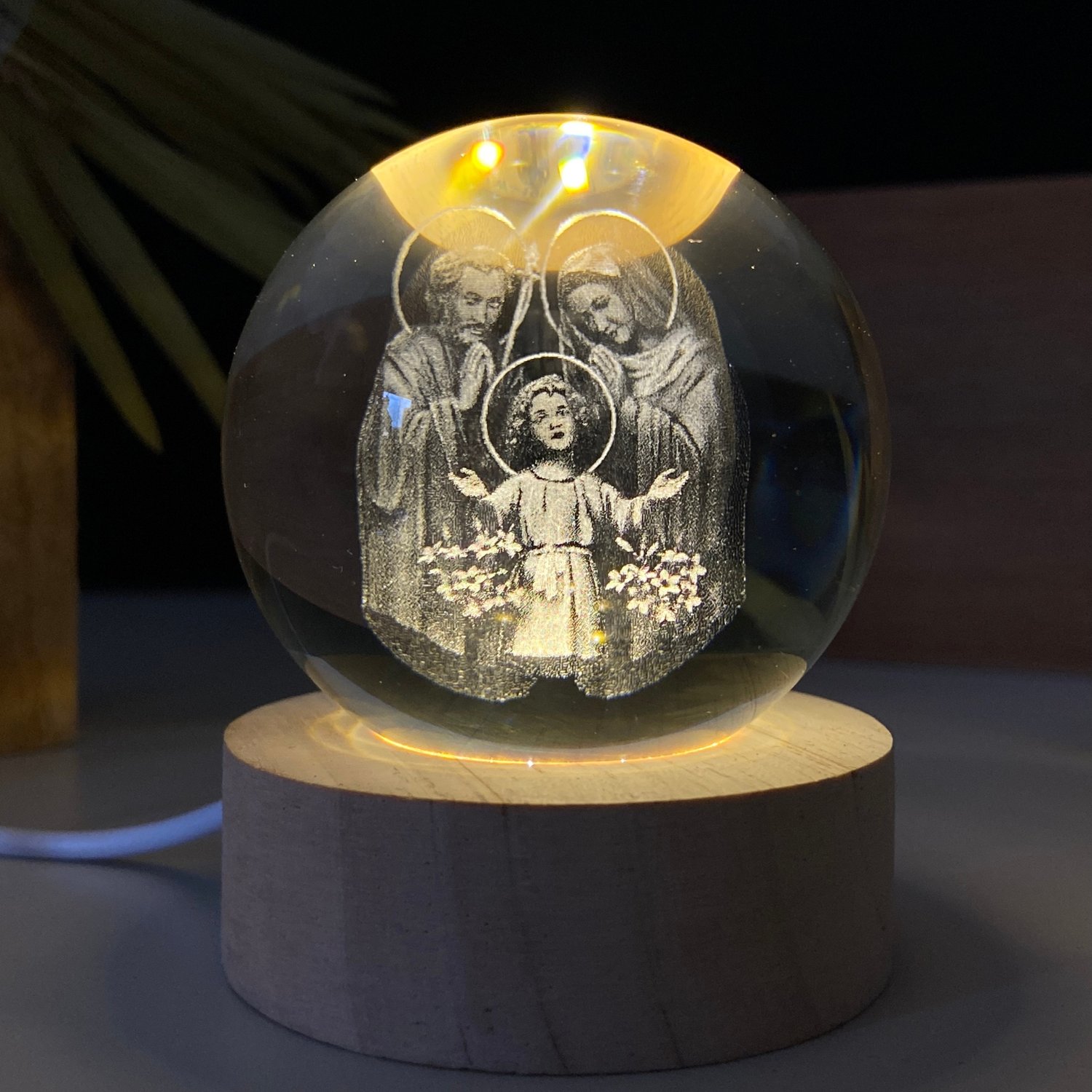 Esfera de vidro esculpida a lazer, com base de MDF e 6 LED´s de alta potência.