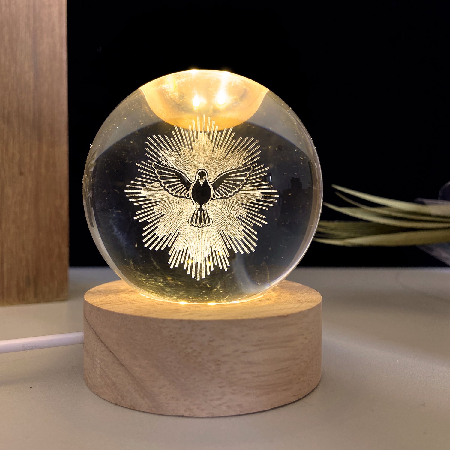 Esfera de vidro esculpida a lazer, com base de MDF e 6 LED´s de alta potência.