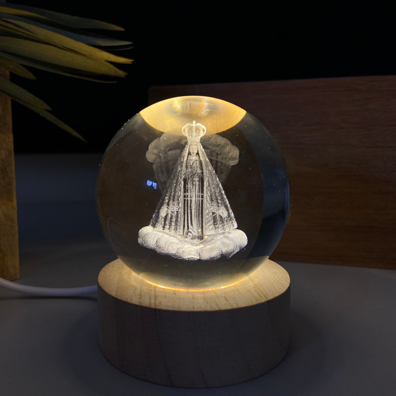 Esfera de vidro esculpida a lazer, com base de MDF e 6 LED´s de alta potência.