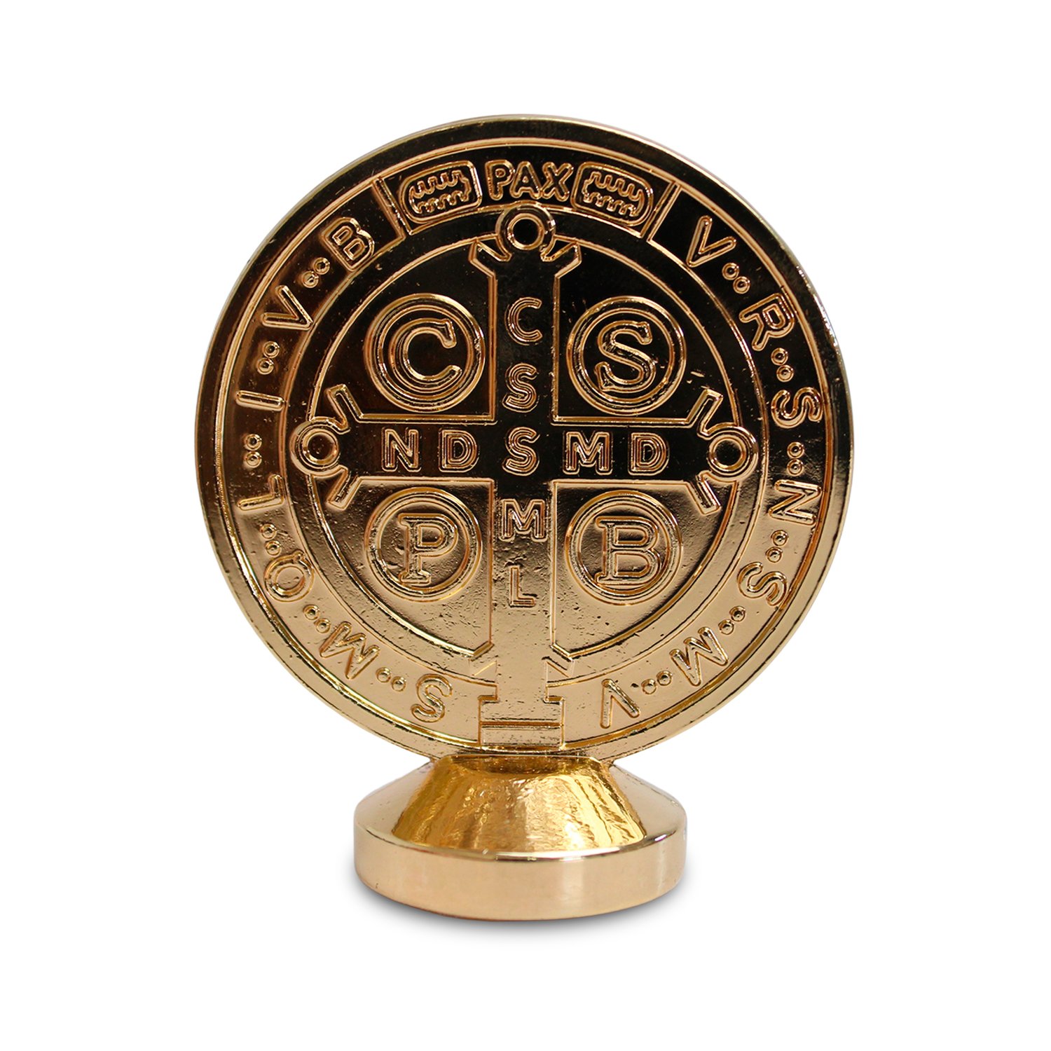 Medalha de São Bento para carro frente e verso dourada, fabricada em metal com acabamento brilhoso.