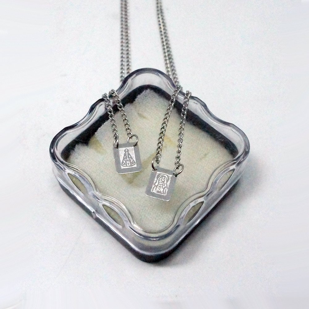 Mini Escapulário de Inox Retangular Baixo Relevo de Nossa Senhora Aparecida e Sagrado Coração de Jesus.