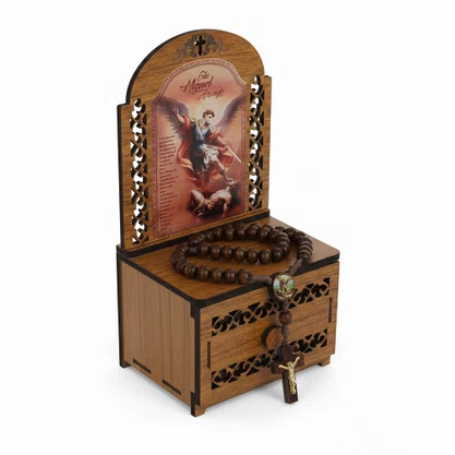 Oratório de MDF revestido com aplique de São Miguel Arcanjo Resinado, acompanha 40 velas de parafina, 1 terço de madeira entremeio de São Miguel, 1 Porta vela de mármore e 1 folheto Quaresma de São Miguel Arcanjo.