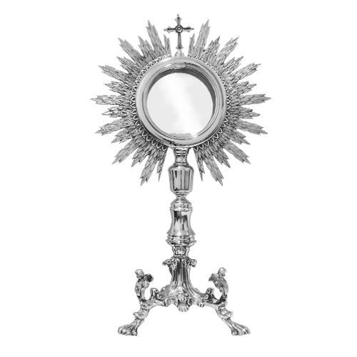 Ostensório/Custódia na cor prata em estanho com detalhe em madeira na coluna.